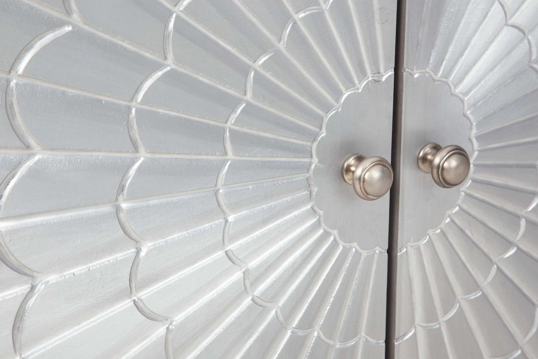 Add a dash of contemporary flair to your home with this accent cabinet. The eye-catching aluminum clad door front with a carved medallion gives a graphic pop that makes this piece stand out. The accent cabinet’s dark brown finish and antiqued silvertone metal lend an urban touch to this stylish storage piece.