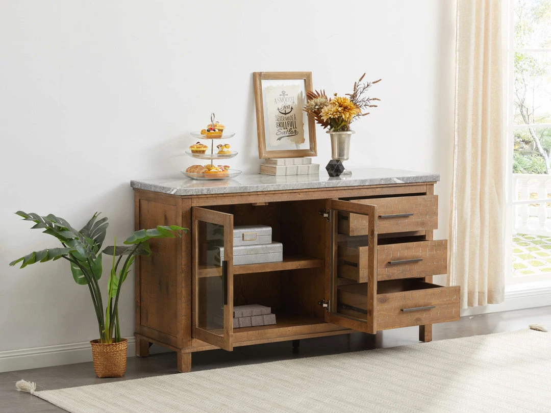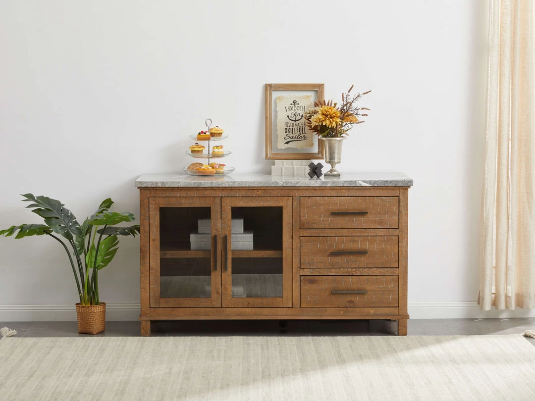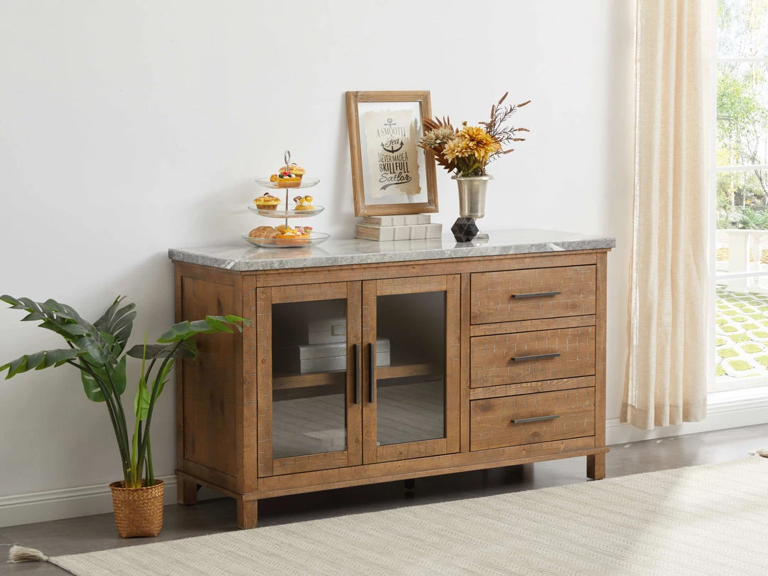 You long for a helping hand getting plates on and off the table. Rest assured, the Aleeda dining room server caters with clean, contemporary style. Crafted with a natural marble top that is both pretty and practical, it includes smooth-gliding drawers, glass front doors and shelving for storing silverware, plates, linens and everything you need to set the table. Adding to its beauty, the marble top’s color variations, fissures, mineral deposits and veining are naturally formed and are not defects.