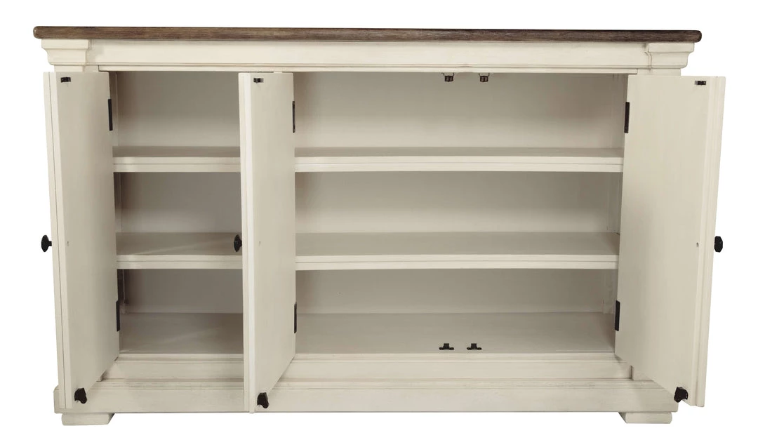 Need a stylish space to store dinnerware and all your dining room essentials? This server is a dream come true with two adjustable shelves that offer large capacity and a spacious top that’s perfect for setting a buffet. Embellished with the casual appeal of three latticed doors, an attractive planked top with weathered oak finish and a lightly distressed white finish throughout, this vintage look will serve up elegance for years to come.