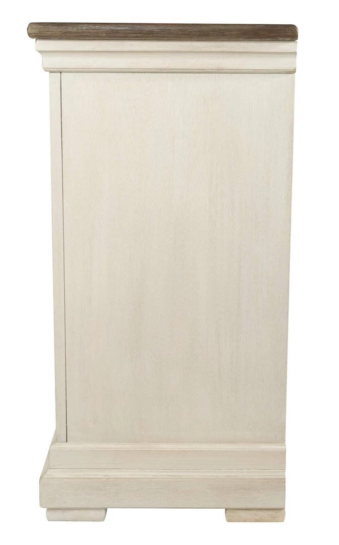 - Two-tone textural finish; weathered oak finished top and antiqued white finish throughout