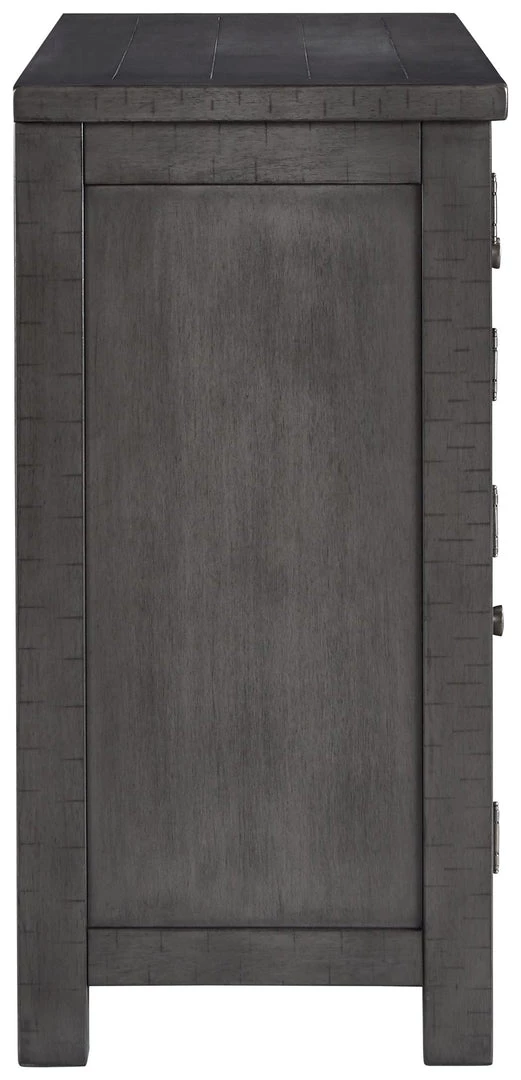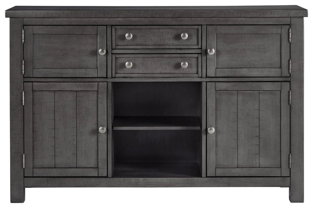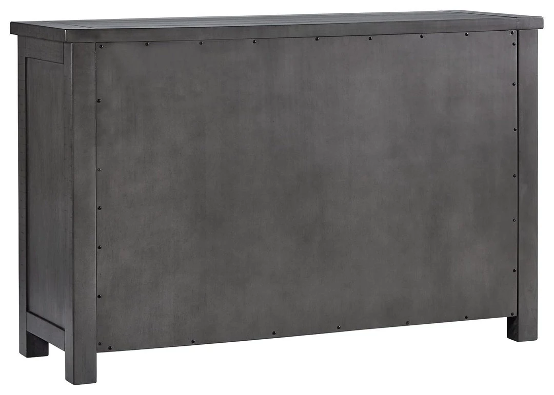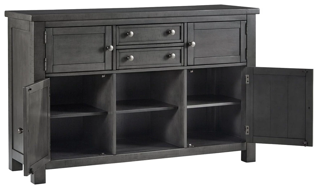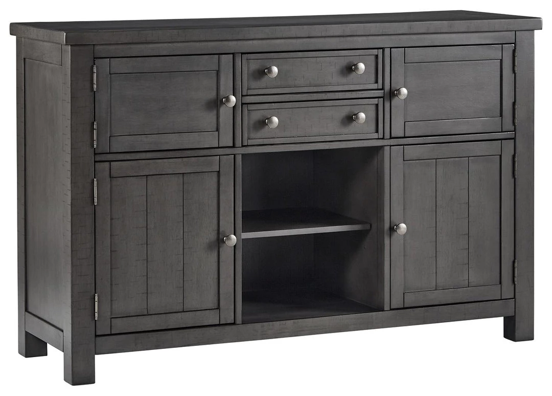 Going gray in the best possible way. This dining room server wows with an utterly on-trend smoky gray finish and plank styling. Crafted of acacia veneer and equipped with an abundance of serving and storage space, this server brings practicality and easy entertaining to your dining room. Just a touch of distressing helps it fit right in with your modern farmhouse decor.