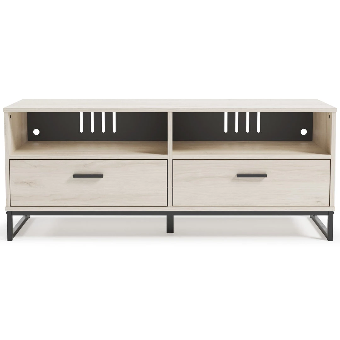 Light and bright, this TV stand is inspired by chic design. A light natural finish over replicated oak grain offers an authentic touch to this piece. Open shelving and two smooth-gliding drawers provide handy storage, while metal legs and pewter-tone handles bring an edgy flair.