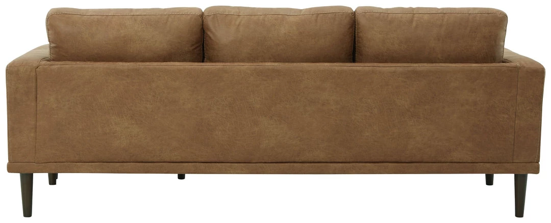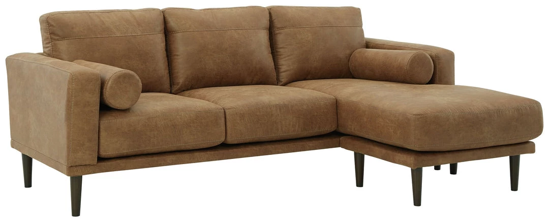 For a fresh spot in your space, turn to this sofa chaise. The invigorating piece breathes warmth into your home with its striking caramel faux leather upholstery, modern bolster pillows and tapered legs. Wind down at the end of a long day and sink into this canyon of comfort.