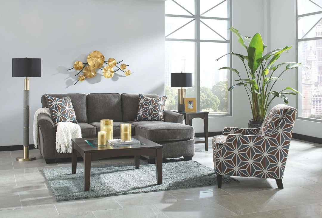 This on-trend sofa chaise sleeper is so casually contemporary. The 1970s era meets modern day allure with an energetic geometric pattern on the toss pillows. Paired together with slate colored menswear chenille, it’s incredibly comfortable and a show stopping sight. Pullout queen memory foam mattress is an added comfort for overnight guests.
