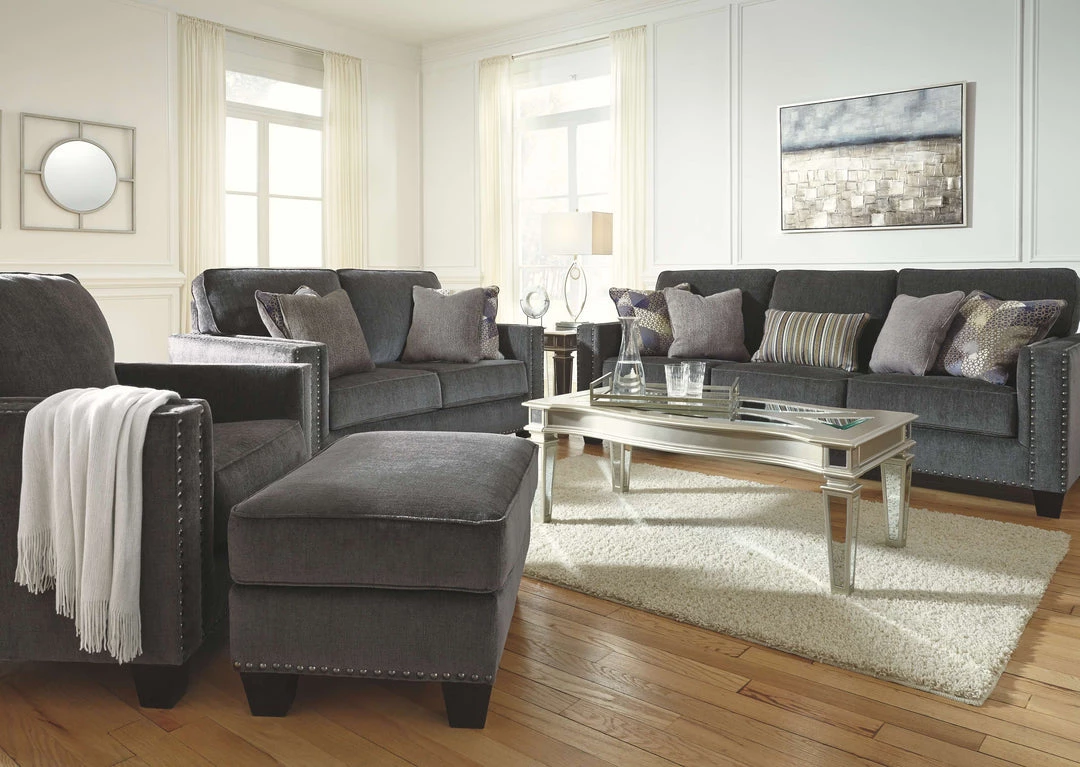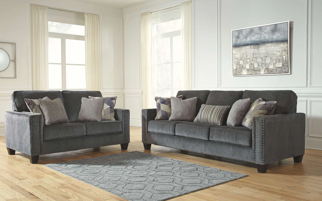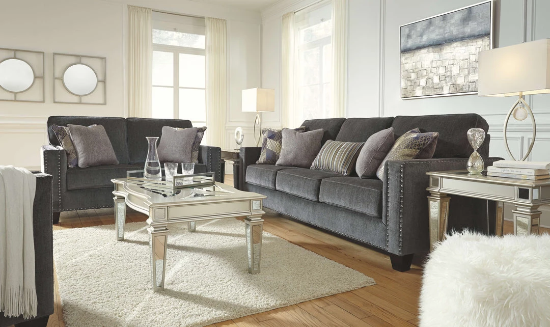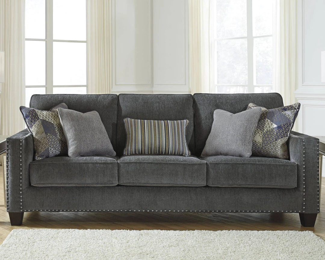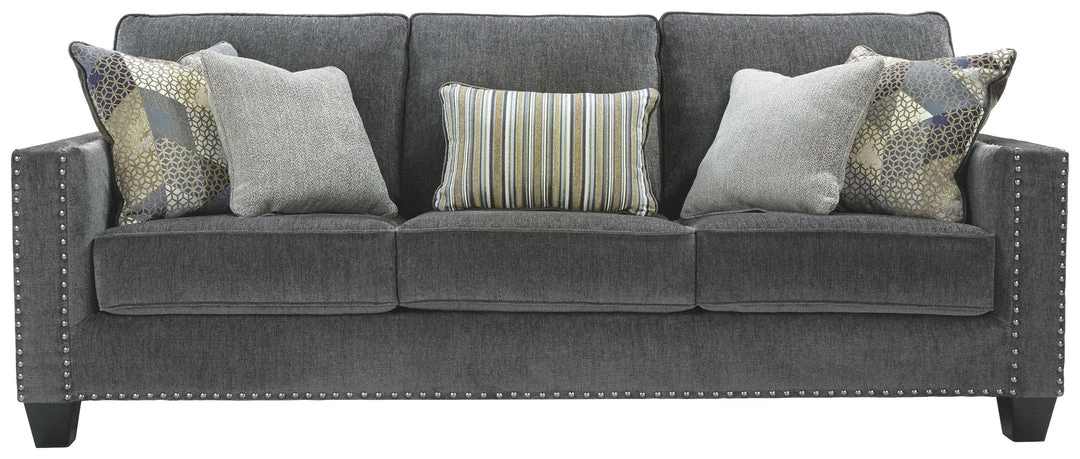 Time to go gray? Find your fill of comfort, style and sophistication in this sofa. Its smoky gray upholstery is sumptuously soft to the touch and beautifully on trend. Ultra-clean lines punctuated with black nickel-tone nailhead trim give this gorgeous gray sofa a cool, contemporary edge. Edgy, arty accent pillows make that much more of a splash.