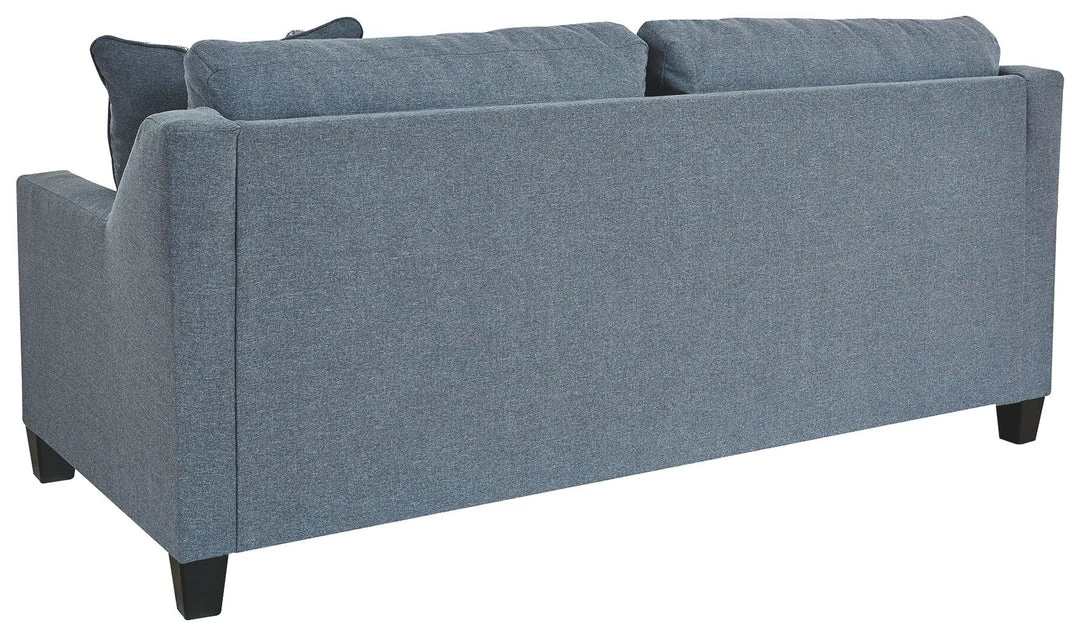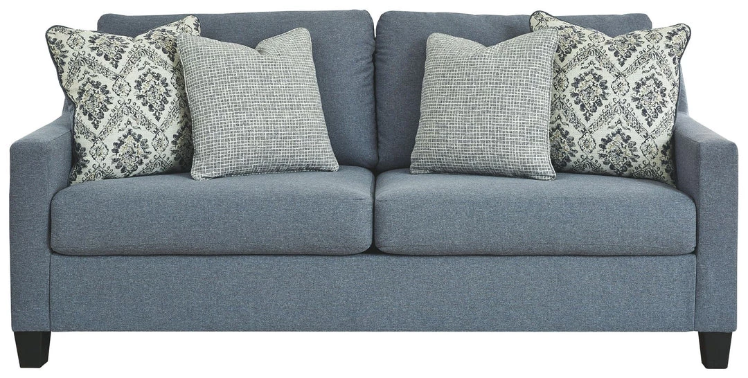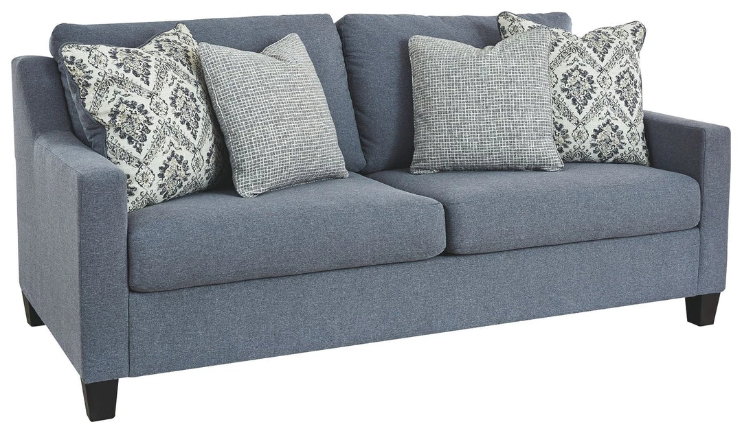 Sporting a 2-over-2 box cushion design for a clean and uncluttered aesthetic, this sofa is a lovely choice in contemporary furniture. Elements include slim track arms with angled flair, sleek tapered feet and a feel-good flatwoven twilight blue upholstery that’s a refreshing change from the everyday ordinary. Assorted throw pillows in mellow, muted tones incorporate an updated farmhouse look.