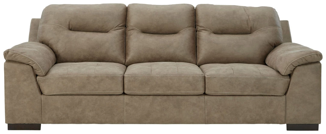 If you love the idea of a luxe look that won’t break the bank, make yourself comfortable with this alluring light-hued sofa in a neutral shade of pebble brown. Designed to look like the real thing, it’s wrapped in a practical faux leather loaded with natural tonal variation and a soft hand feel. Appealing to a contemporary taste, its jumbo stitching, tufted styling and pillow top armrests are indulgently comfortable, with a streamlined look that tops off the high-end aesthetic made for everyday living.
