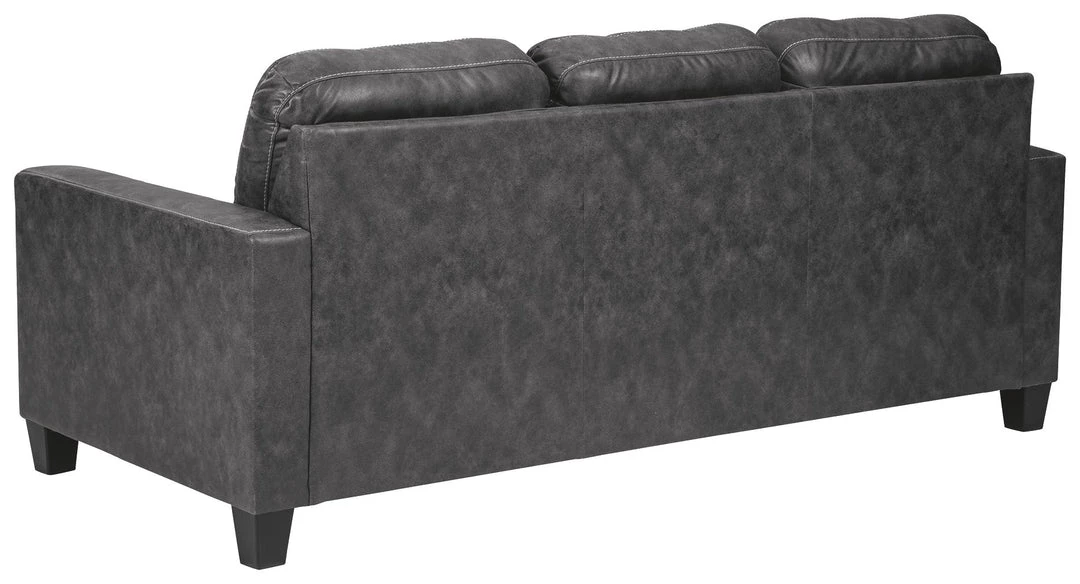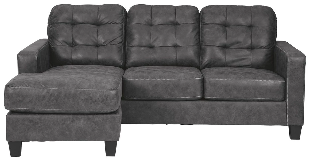 This ultra-contemporary sofa sleeper invites you to spread out and make yourself comfortable. Linear track arms offer a clean, sleek aesthetic, while tufted box cushions are a nod to mid-century design. Rest assured, a movable ottoman and reversible seat cushions allow you to place the chaise on either side for the perfect fit. Gunmetal gray faux leather offers the cool, weathered look you love and touchably soft feel you crave. Pull-out queen mattress in quality memory foam comfortably accommodates overnight guests.