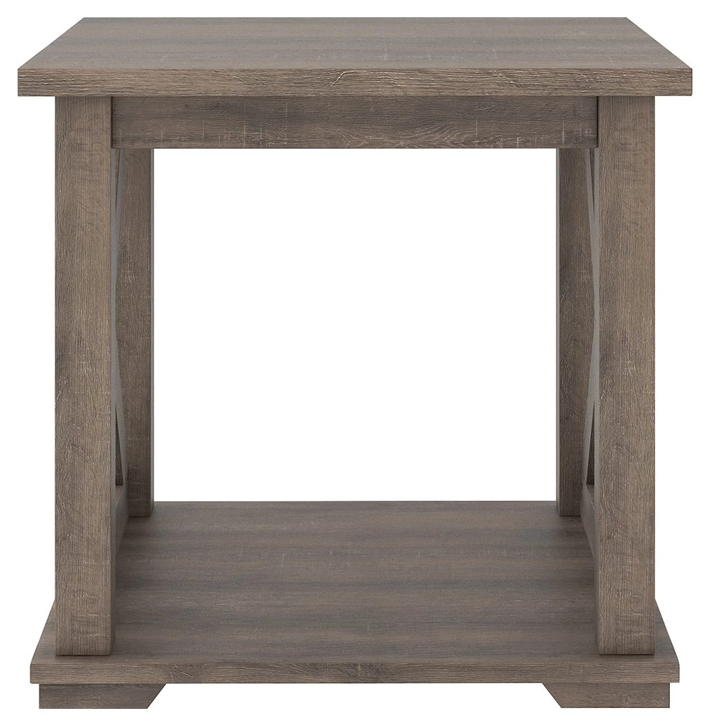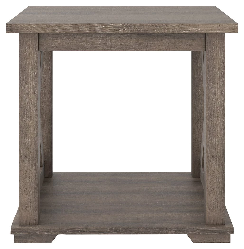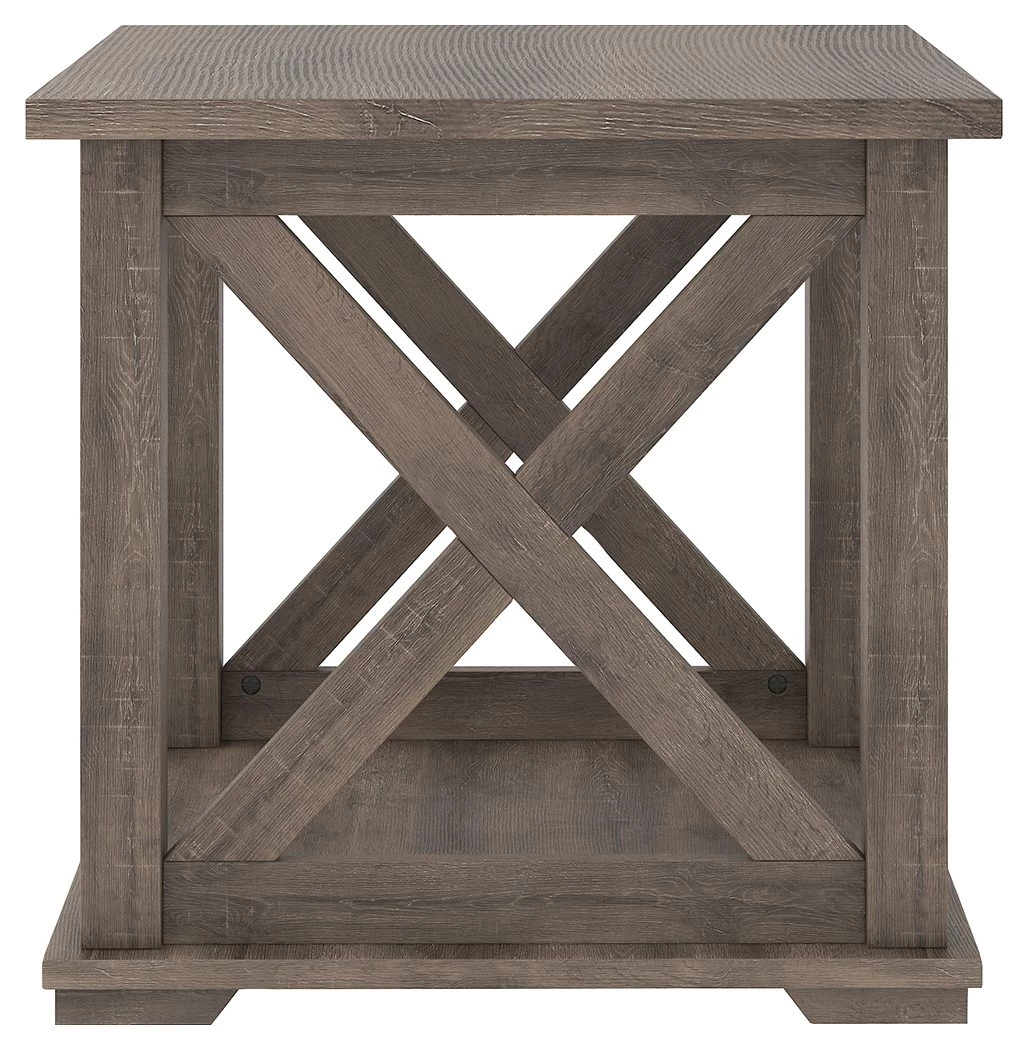 Raise the bar on modern farmhouse design with this essential end table. Sporting a handsome weathered oak effect and cross buck design, this table makes a statement wherever it lands. With its generous shelved storage space, this home essential is packed with possibilities.