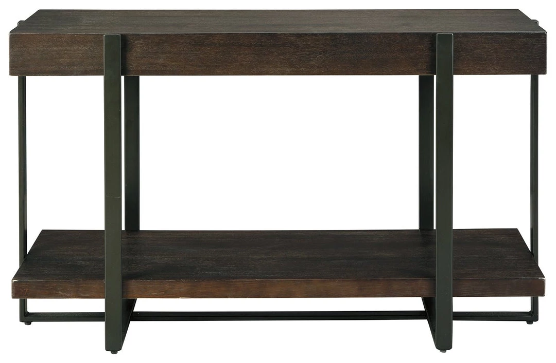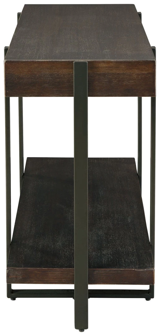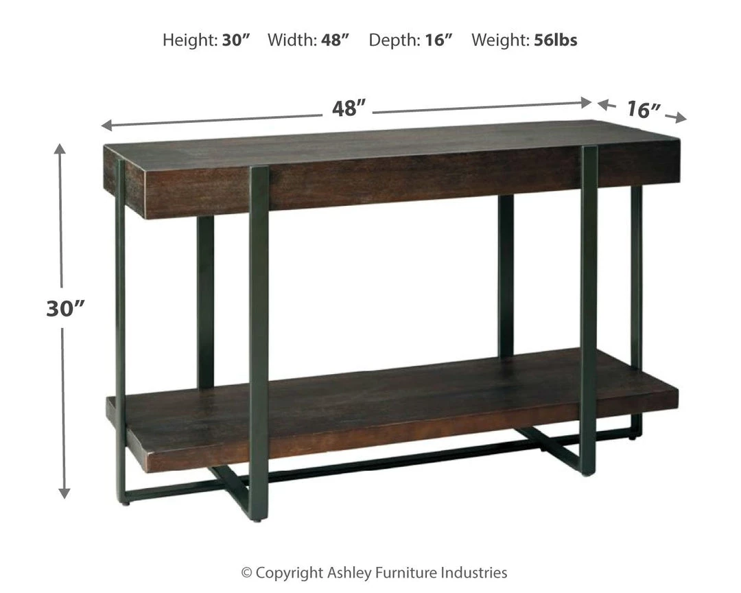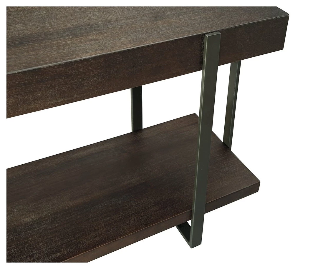 Pairing a thick slab-style top crafted of veneer and engineered wood with a linear metal base, this sofa table is an achievement in urban-contemporary design. The aesthetic might be ultra cool, but a dark brown finish with wire-brushed texturing keeps the feel warm and inviting.