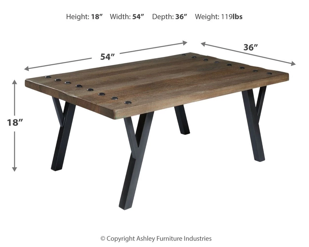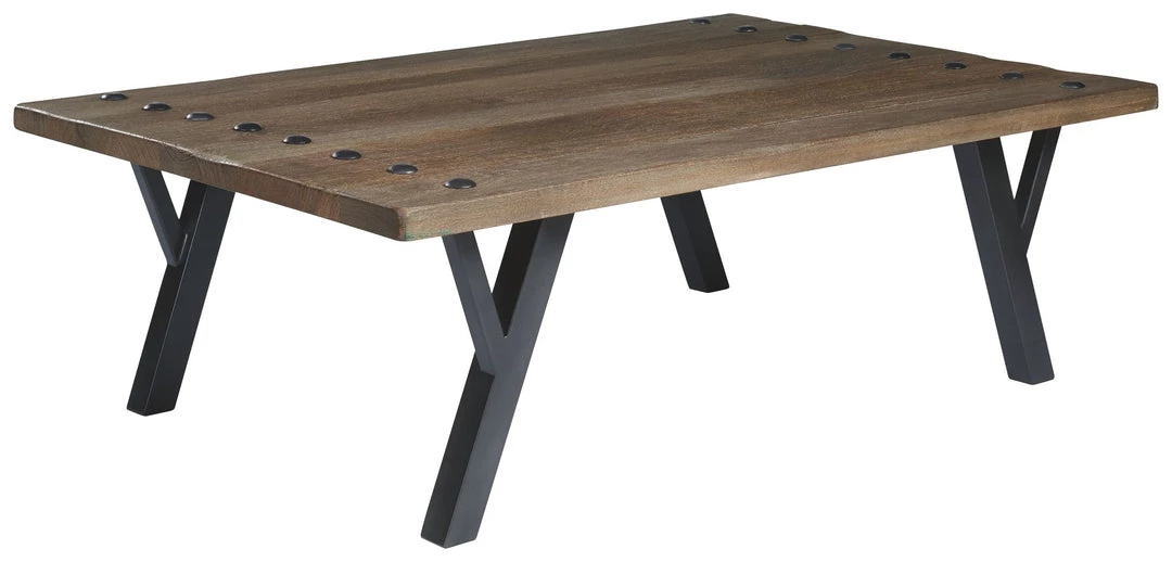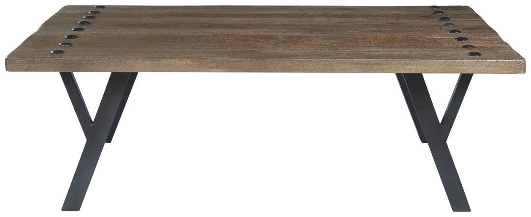 This coffee table is a riveting example of urban casual design. The plank effect mango wood top is finished in a clear nutmeg color for a naturally beautiful effect. Striking cantilevered metal legs and rivet head accents tie the look together for a well-edited aesthetic.