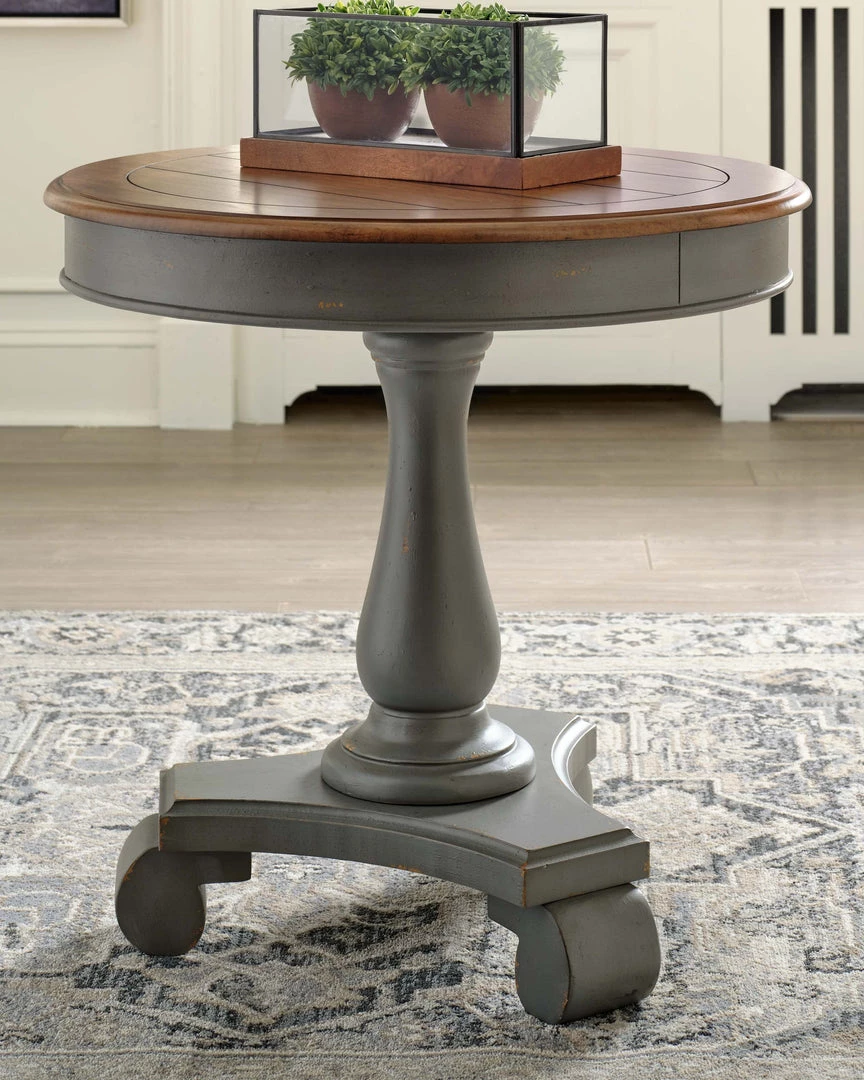 Achieve the vintage casual look you love with this accent table. A stylish addition with a simple design in antiqued gray and brown finishes, this accent table completes any room.