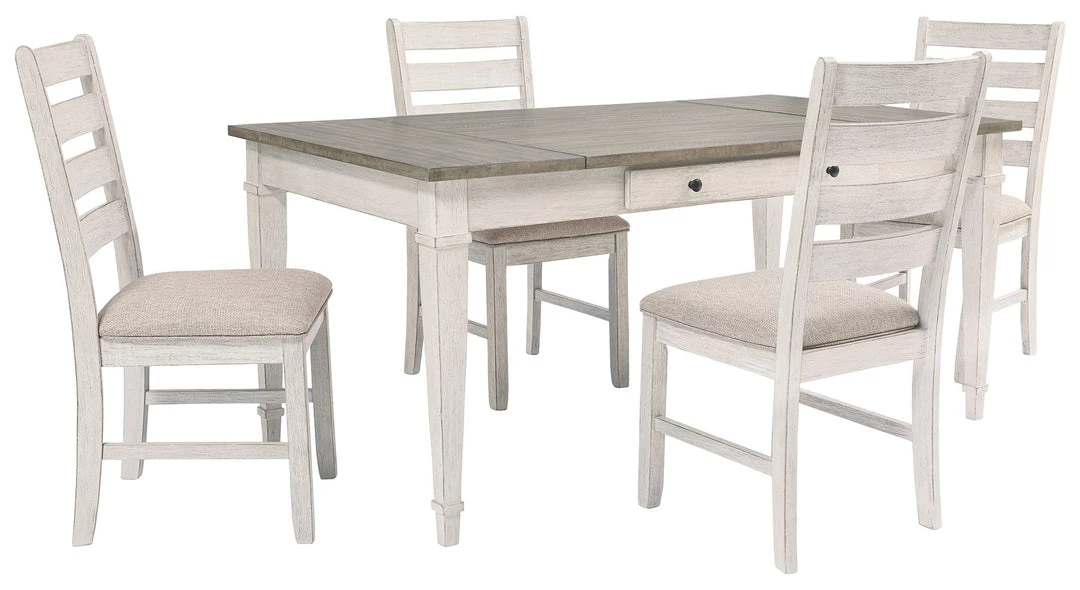 Set the scene for coastal chic or modern farmhouse living with this dining room table. Clean-lined, simply striking table doubles the charm with a brown tone top with plank effect, paired with a grayish white base with rub through effect for timeworn appeal. Multi-functional dining table features two convenient side drawers and a storage bin on each end for maximum use of space. Styled to comfortably seat six, this table makes room for one and all.