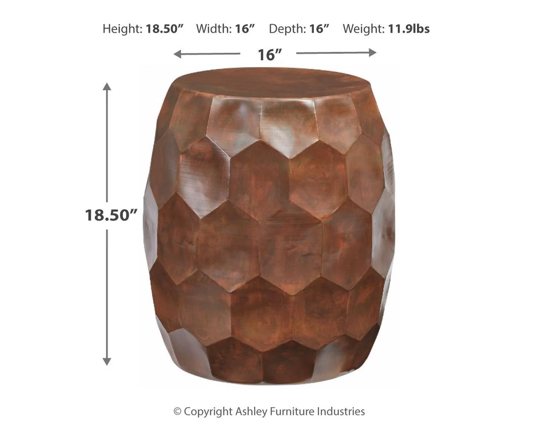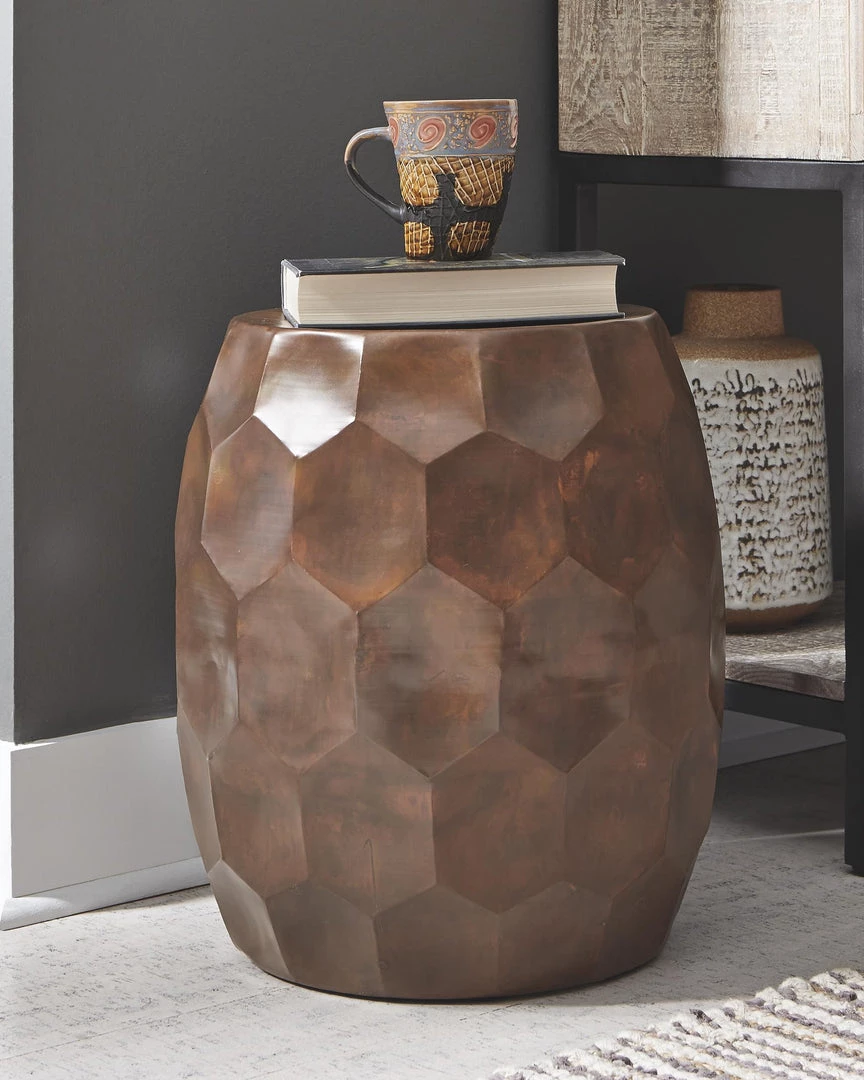 Bee cool with this accent stool with honeycomb design. Thanks to its indoor/outdoor safe treatment, you can feel free to use it wherever and however you please. Burnt copper-tone finish is loaded with earthy elegance.