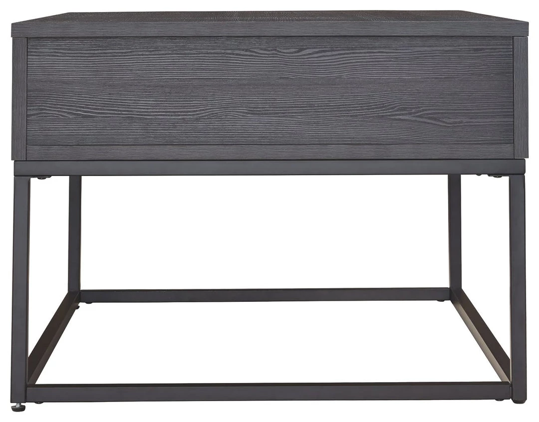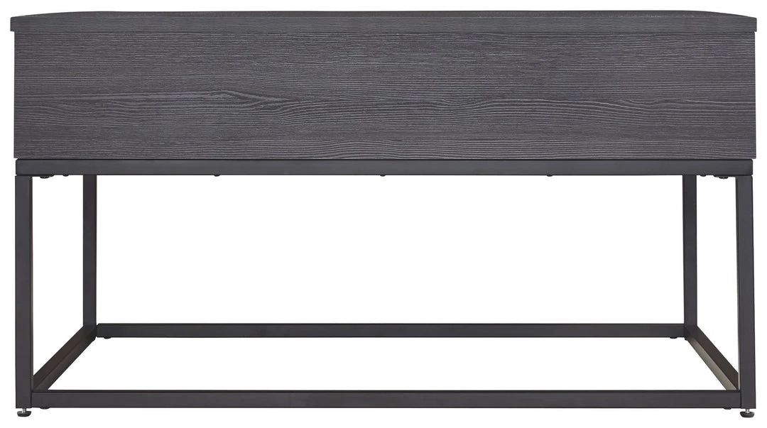 This cocktail table offers a casual, contemporary look for modern living. This piece provides a functional lift top design as a small space living solution. It has a replicated blackened wood finish with a grayed, textural grain for a classic look. The metal base elevates the table to create open space that adds a sense of lightness to your room.