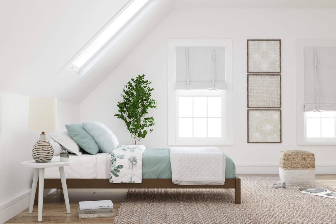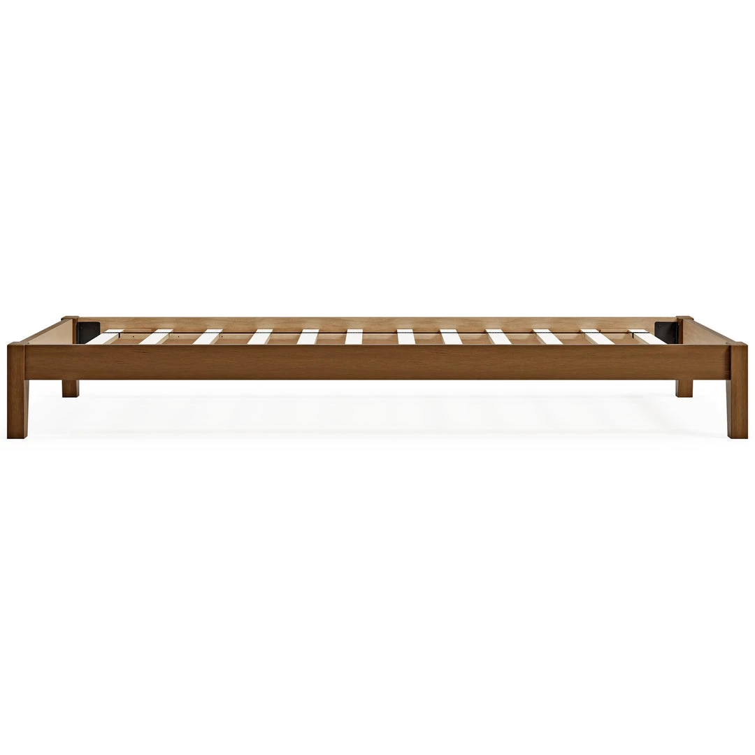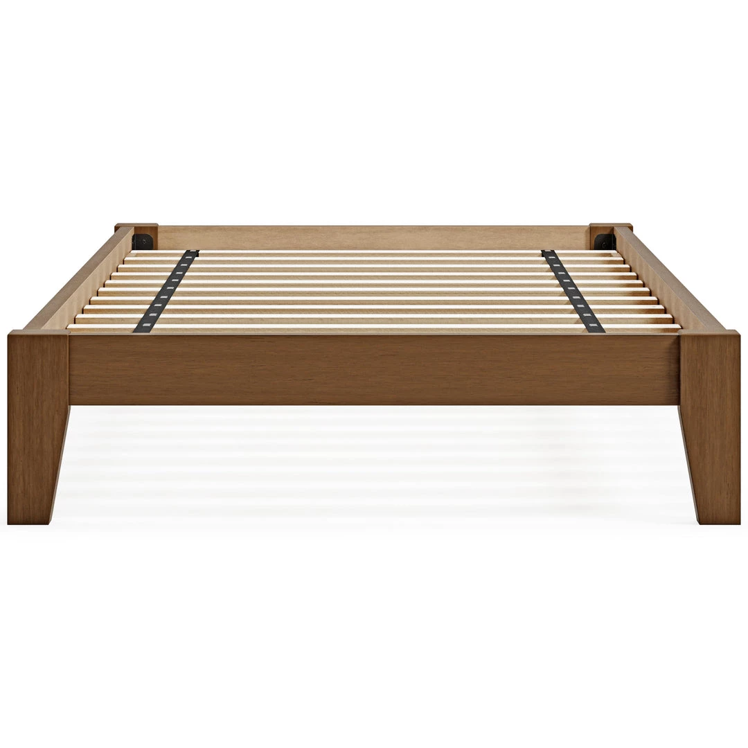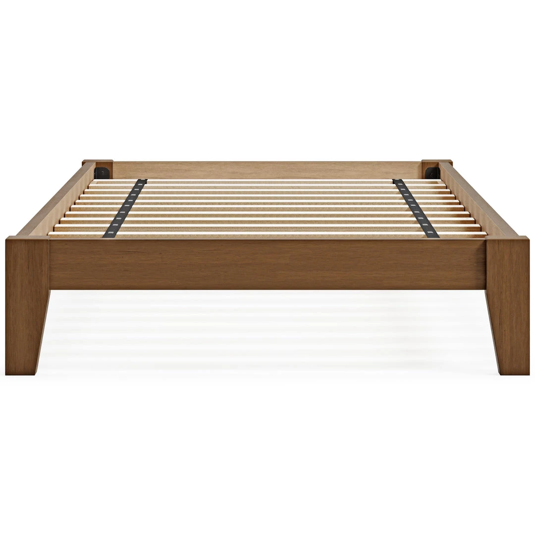Simple living and streamlined design come together in one exceptional piece with this platform bed. Constructed with a solid wood frame finished in an elegant light walnut-tone color, the sturdy slats support your mattress without the expense of a foundation or box spring.