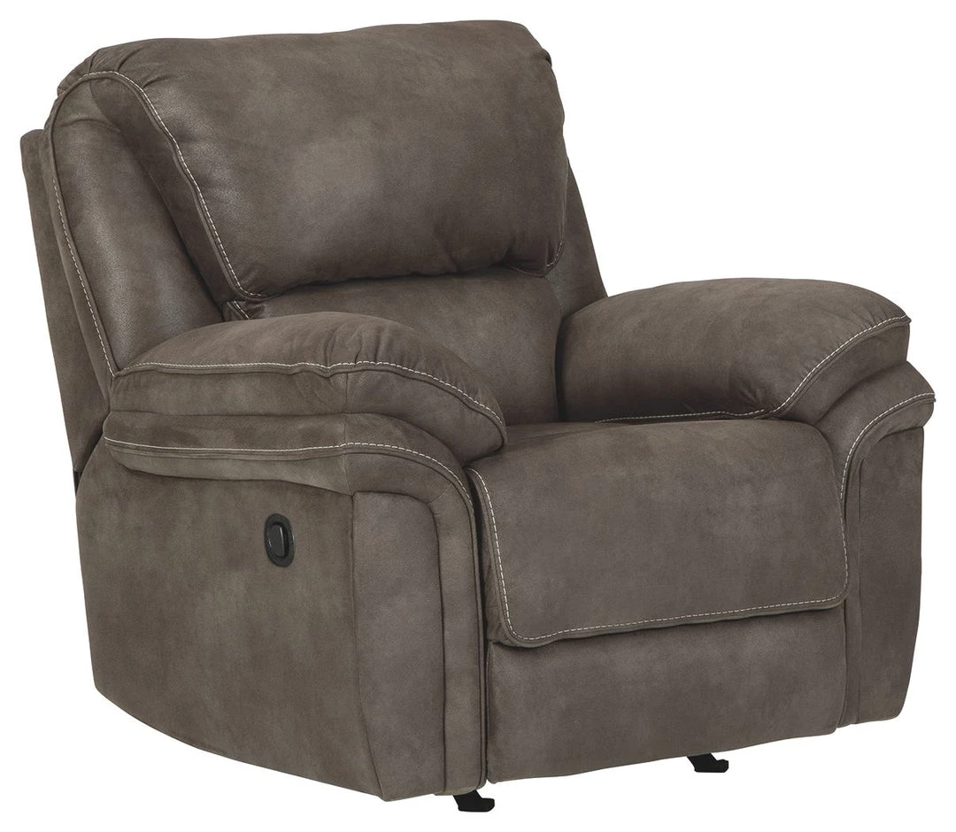 Get the cool leather look you love—and the cozy feel you crave—with this rocker recliner in gorgeous graphite. Rest assured, this recliner’s padded faux leather suede with weathered distressing looks so much like the real thing. Unique design elements include high-contrast jumbo stitching that calls attention to the padded wraparound effect. And talk about pampering. Double padded armrests and back cushioning offer a level of cradling comfort that’s second to none.