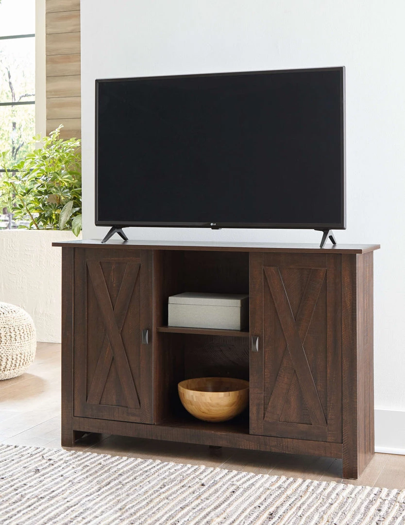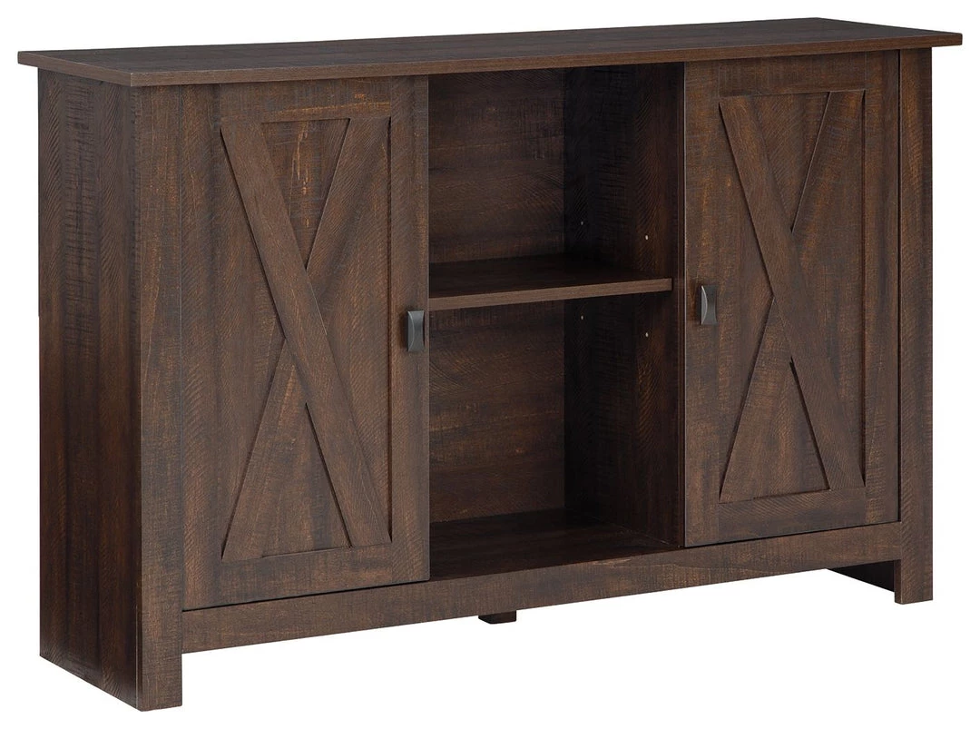 Casual and vintage style meet to make this accent cabinet. Two open storage cubbies allow you to feature decorative pieces or photographs. Additional concealed space behind two doors makes for an excellent storage solution. The crossbuck pattern door front adds a vintage feel, while the antiqued brown wood laminate makes this a versatile addition to your space.