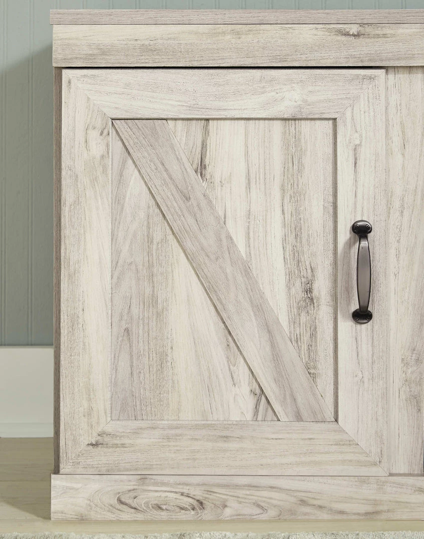 Express your modern farmhouse style with this TV stand with fireplace option. Its wispy white finish over replicated oak grain is a delightful change from the ordinary. Clean-lined, classic styling with barn door inspiration provides a country-chic aesthetic that’s a breath of fresh air.