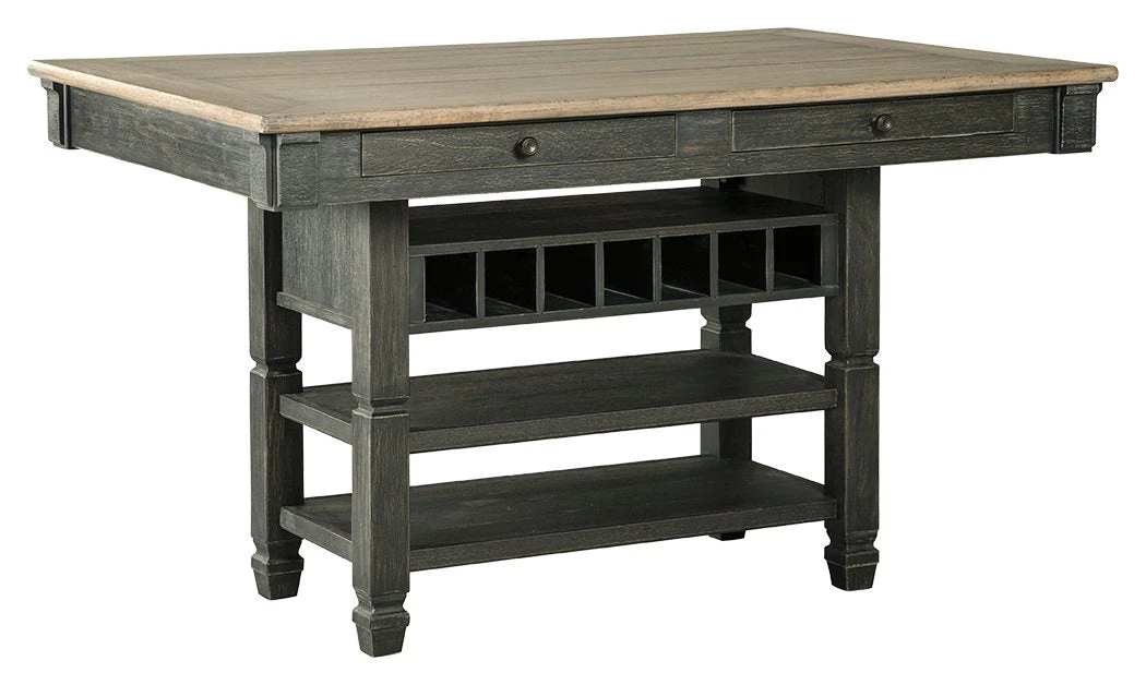 Invite your family into the heart of your home with this rectangular dining room counter-height table. Black finish is beautifully textured. Timeworn planked oak top creates a unique two-tone contrast. Base provides plenty of storage for wine bottles and other essentials. Put away smaller items in the drawers. This is trend-right urban farmhouse style.
