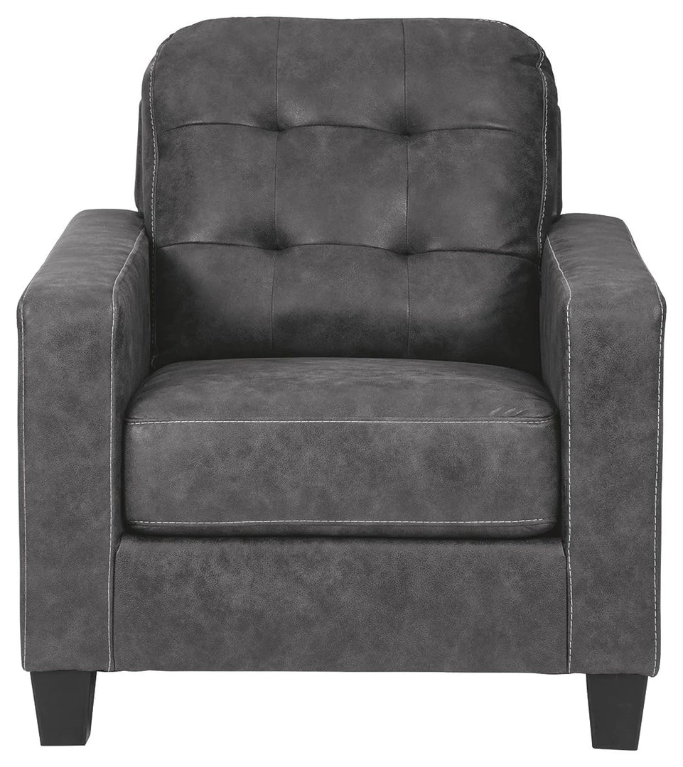 This ultra-contemporary chair invites you to kick out and make yourself comfortable. Linear track arms offer a clean, sleek aesthetic, while tufted box cushions are a nod to mid-century design. Gunmetal gray faux leather offers the cool, weathered look you love and touchably soft feel you crave.