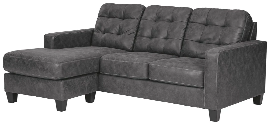 This ultra-contemporary sofa chaise invites you to spread out and make yourself comfortable. Linear track arms offer a clean, sleek aesthetic, while tufted box cushions are a nod to mid-century design. Rest assured, a movable ottoman and reversible seat cushions allow you to place the chaise on either side for the perfect fit. Gunmetal gray faux leather offers the cool, weathered look you love and touchably soft feel you crave.