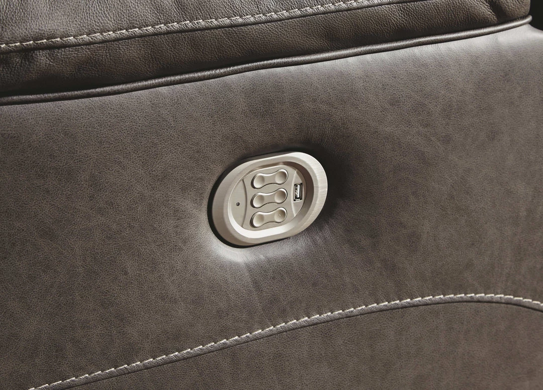 Big and bold, this power recliner with Easy View— power adjustable headrest delivers comfort at the touch of a button. Easily position the recliner, its headrest and lumbar support to your liking for maximum comfort. Plus, with the convenient USB charging port, a cell phone or laptop can be charged without having to get up. The feel of heavy weight leather surrounds you via the cushioned seat, interior bustled back cushioning and pillow top armrests, while faux leather is on the back and sides for affordability. The cloud effect seen in the smoke-colored upholstery creates a rustic look—perfect for your modern or casual setting.
