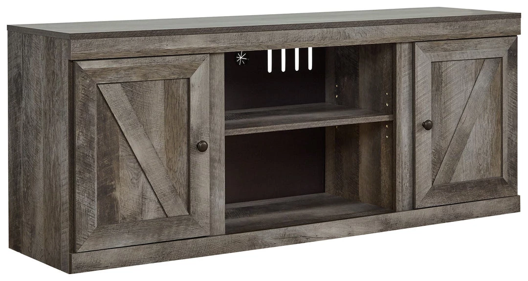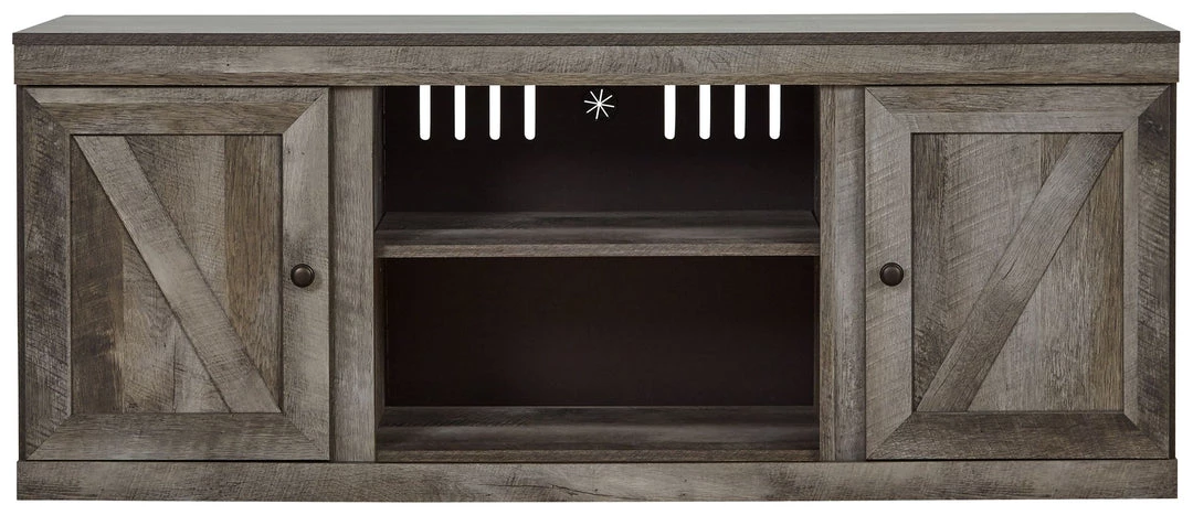 This TV stand is sure to win your heart with its daring take on modern rustic design. Its crisp, clean minimalist-chic profile is enriched with a striking replicated oak grain, thick plank styling and a rustic gray finish for that much more authentic character. Crossbuck detailing adds a brilliant barn door inspired touch. Opt for the optional fireplace insert (sold separately) for added warmth.