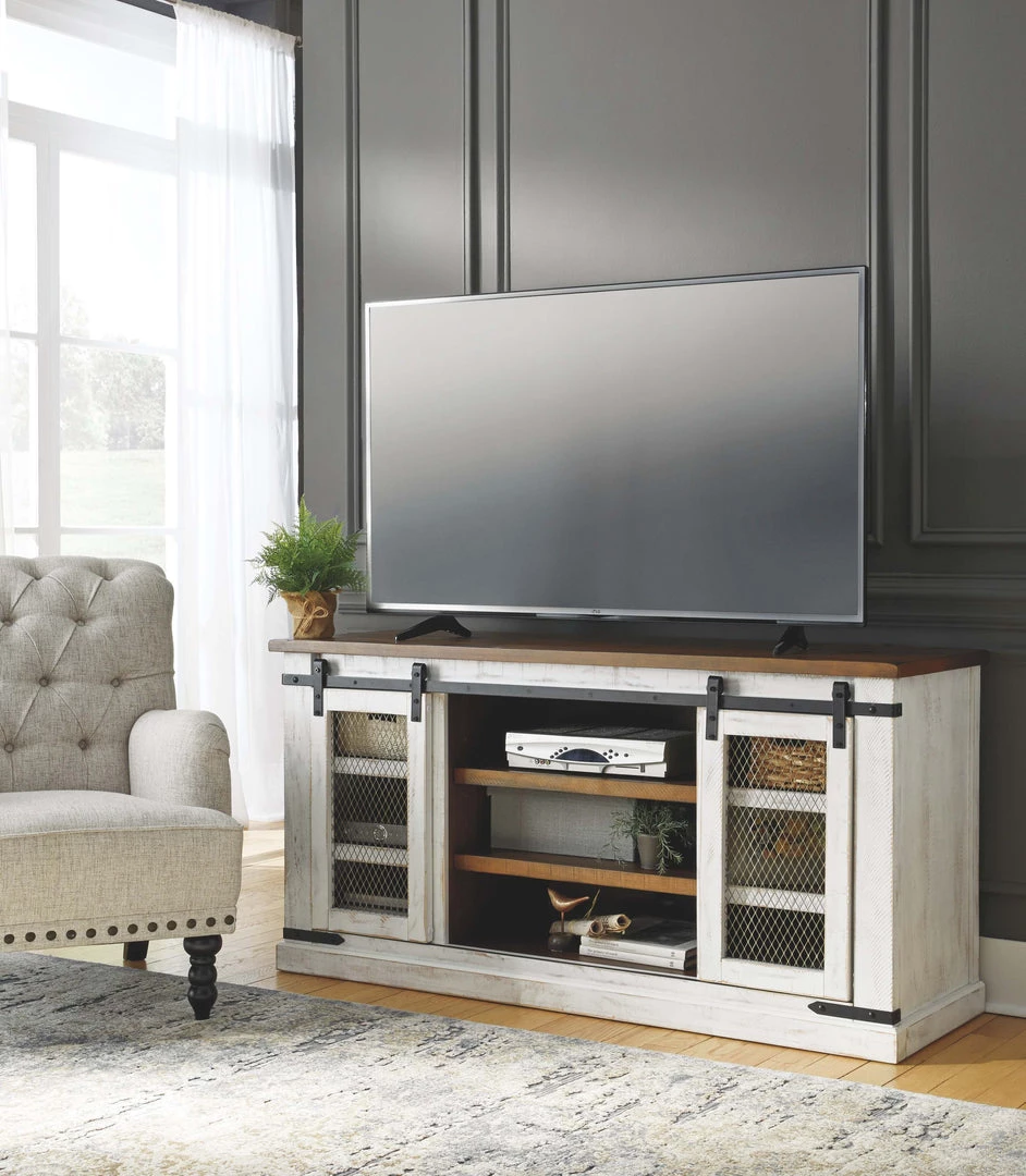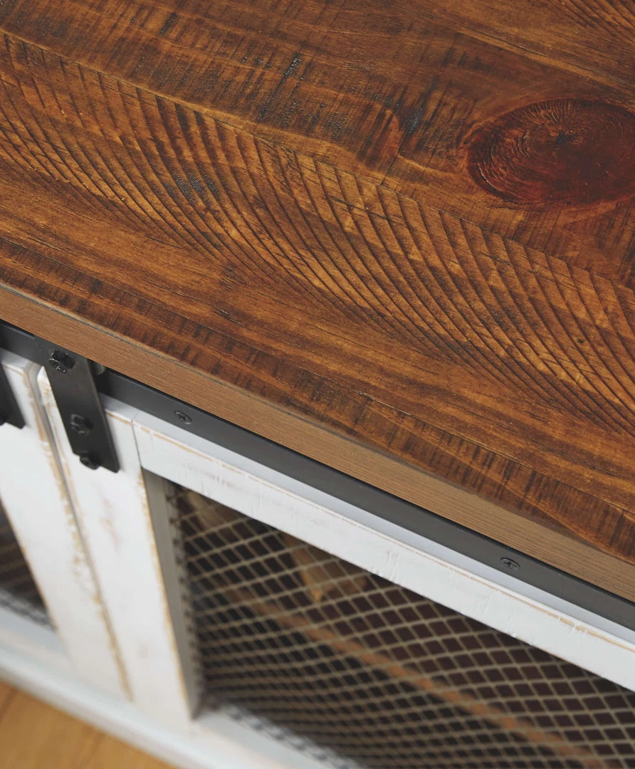 Double take. Sporting a two-tone finish that pairs a distressed vintage white with an aged natural pine-color top and shelves, this TV stand elevates the art of rustic farmhouse living. Enhancing its charm: sliding barn doors with inset metal grills and antiqued gray industrial hardware.