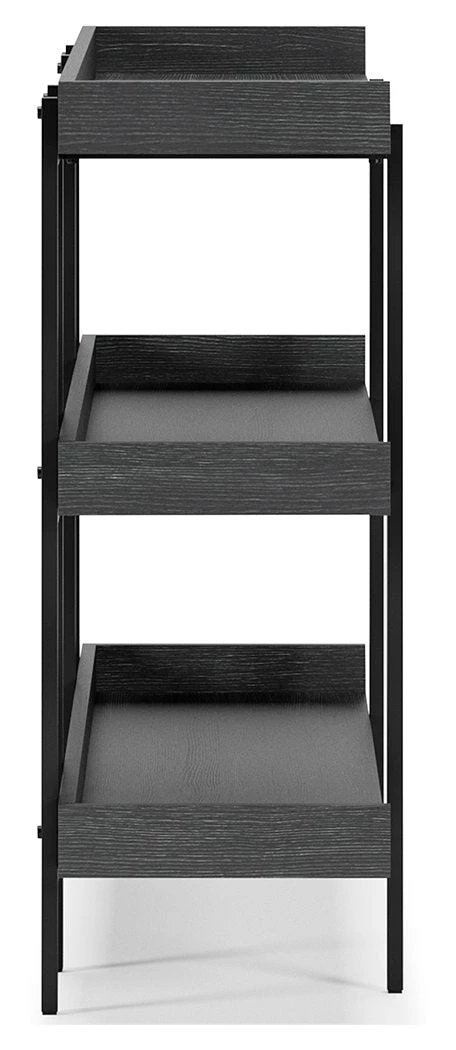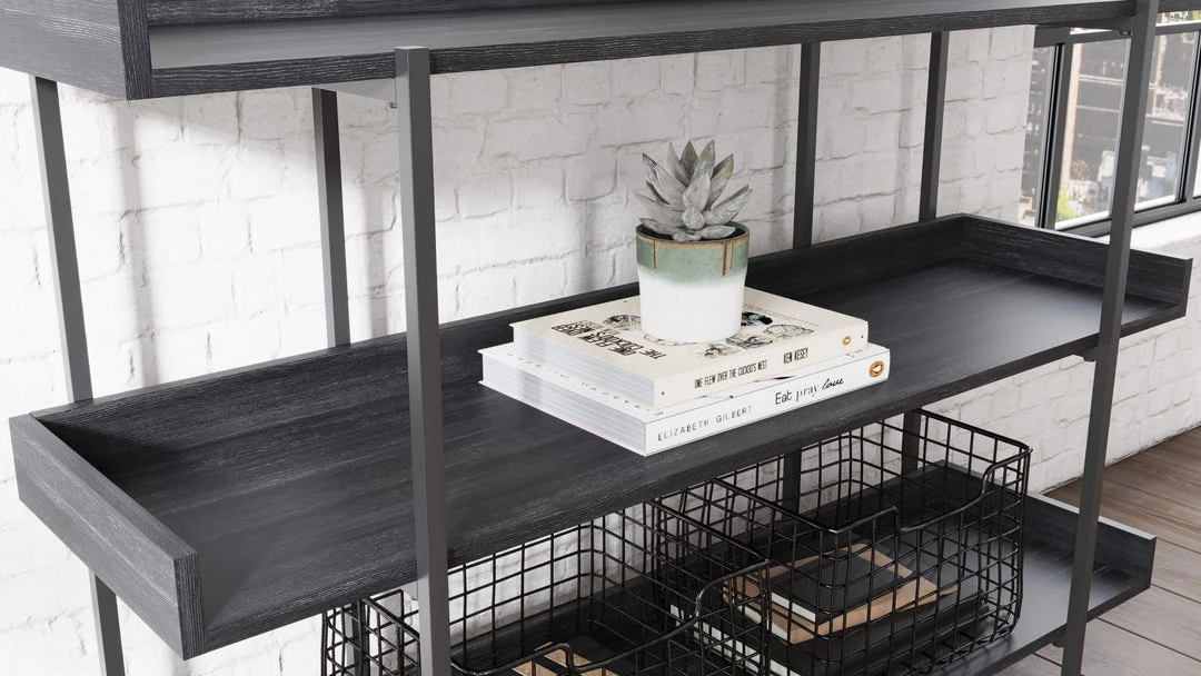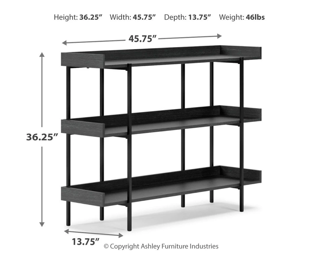 Elevate your home office with the simply sensational wide bookcase. Pairing a dark wood grain look with a black metal frame for modern appeal, this minimalistic bookcase with a trio of gallery shelves is dressed to impress in a no-muss, no-fuss way. Load it up with books, decorative storage baskets or home accents. However you use it, you’ll love its open-concept design and right-on-trend look and feel.