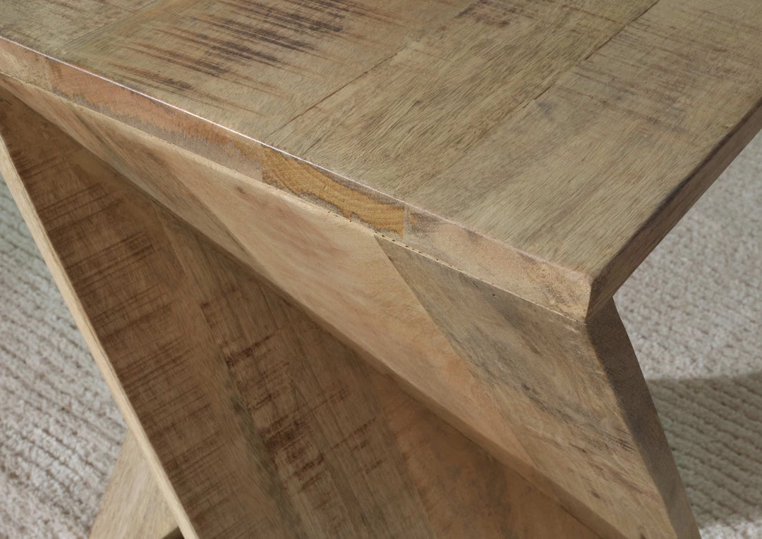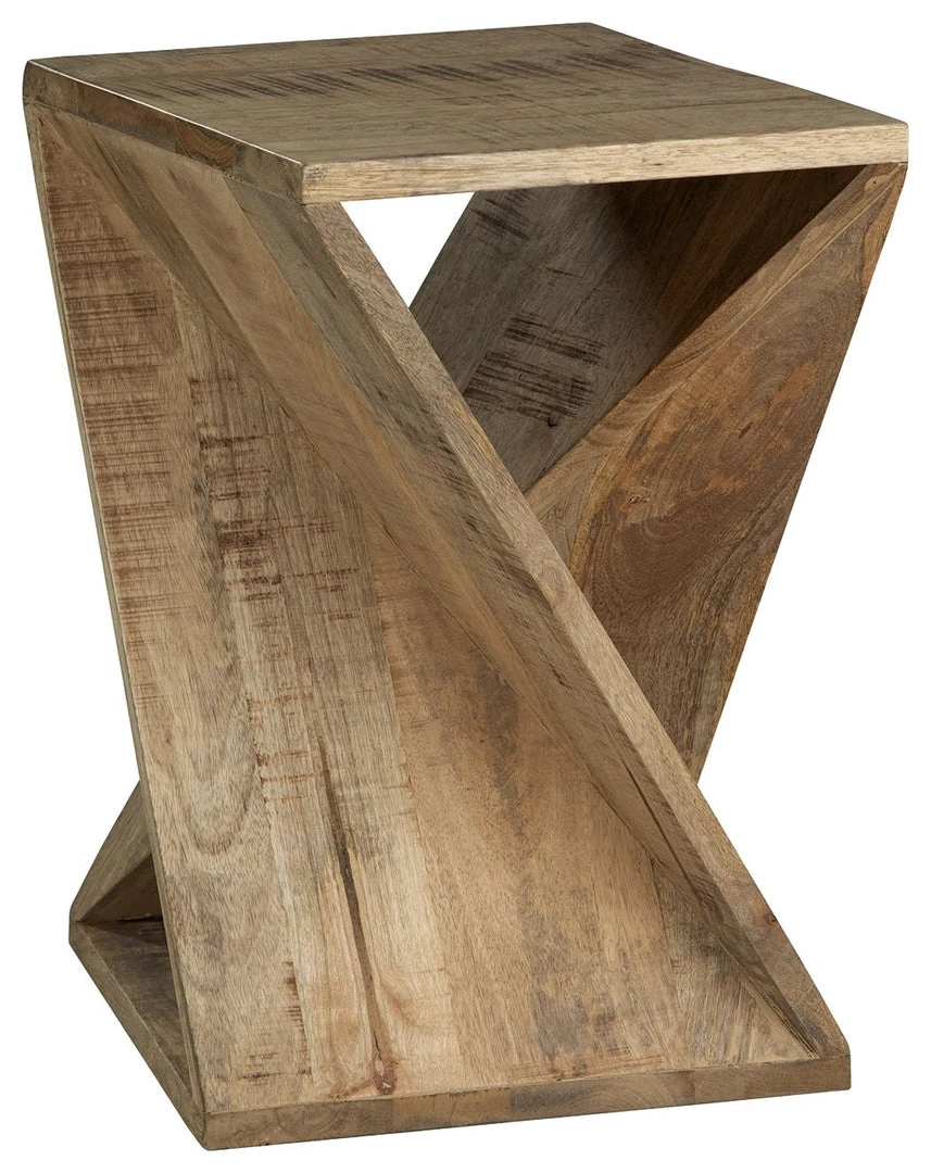 This accent table puts a new twist on vintage casual. Its brown finish is delightfully distressed, drawing attention to the saw mark planks arranged in an open architectural design. Place this unique piece next to a cozy chair to create a charming reading nook overflowing with visual intrigue.