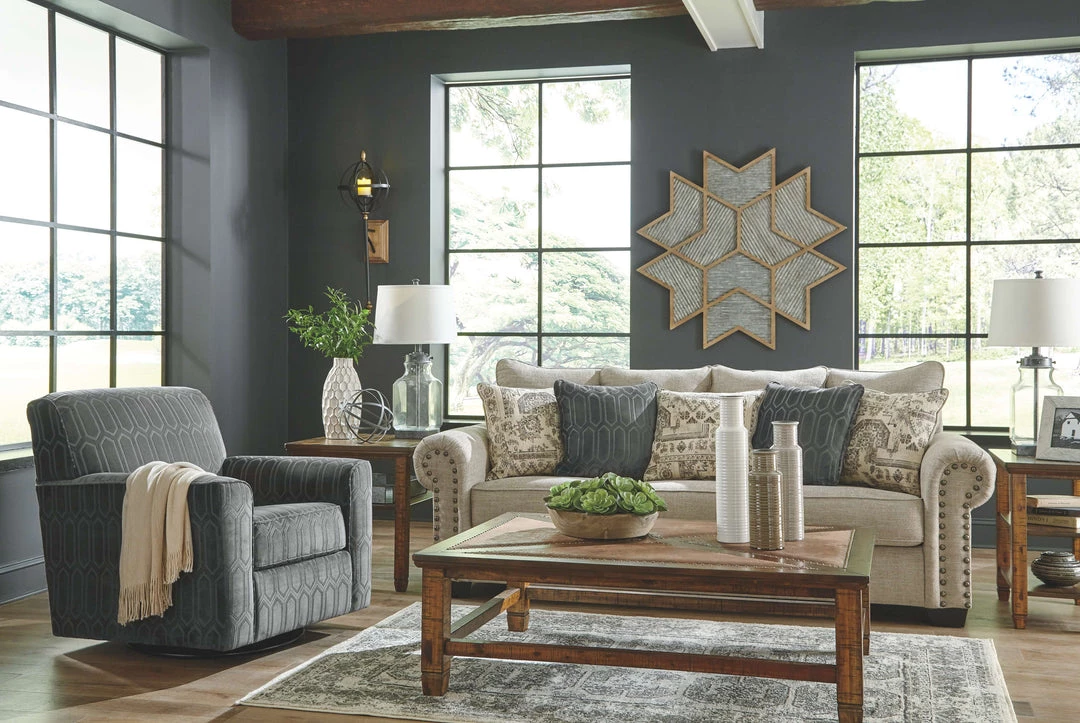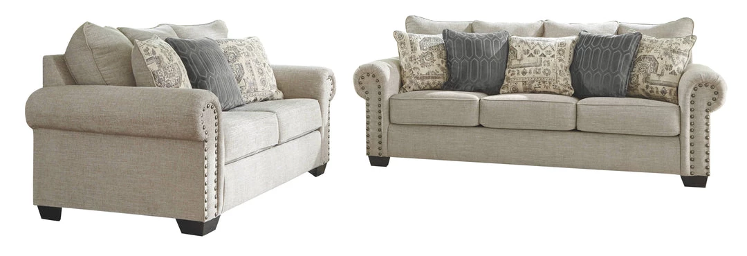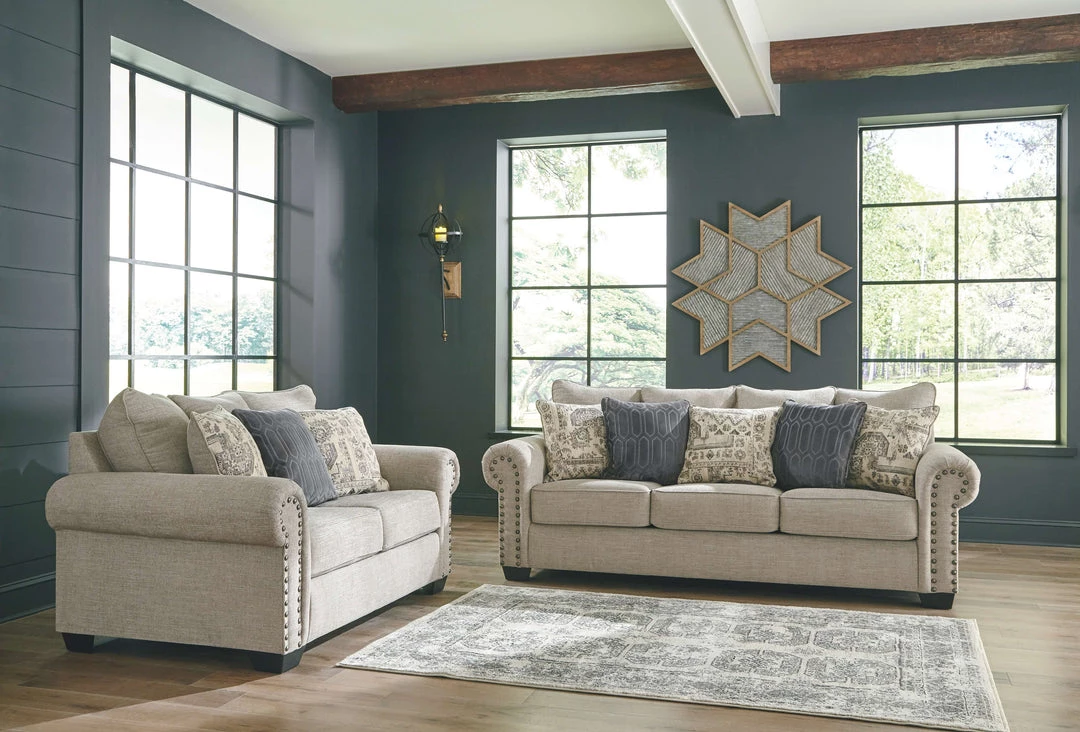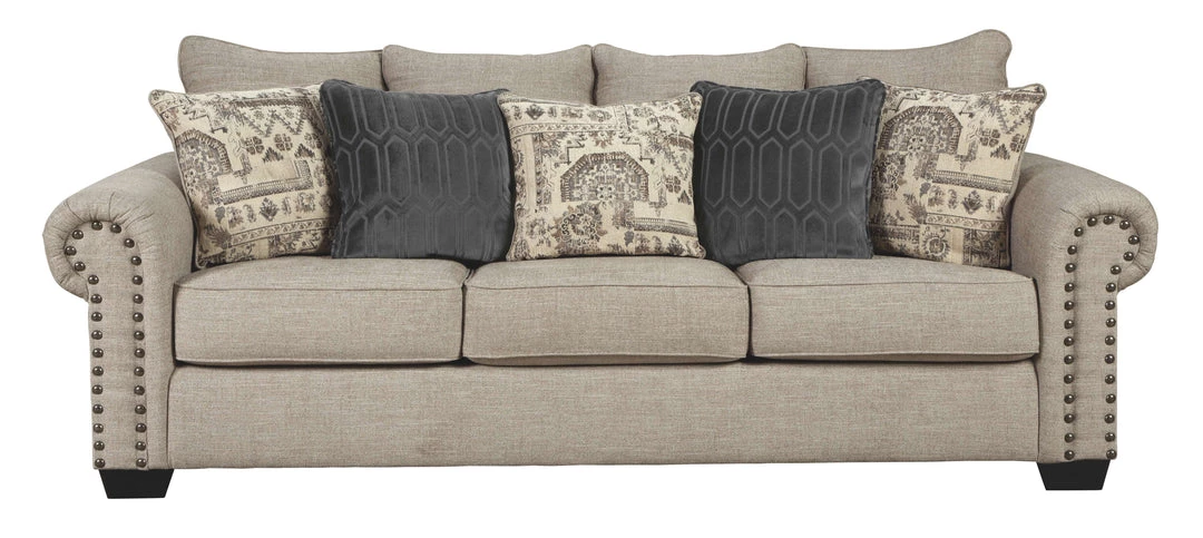 This sofa lets you make a high-style statement at a comfortably affordable price. Richly traditional roll arms are given a modern punch care of oversized nailhead trim in a black nickel-tone finish. Linen-weave upholstery in fresh and clean sandstone beige is complemented with textural pillows that are so plush to the touch.