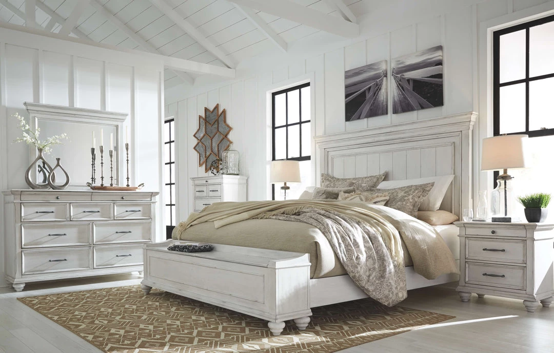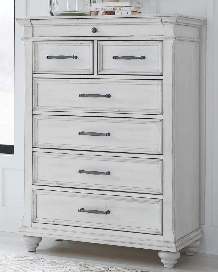 Made with veneers and select hardwood solids in a distressed whitewashed finish. Design features updated traditional styling with generously scaled moulding details. Dresser features 7 full sized drawers with 2 small scaled accessory drawers. Ball bearing side glides. Hardware has a transitional aesthetic and is finished in a dark gray pewter color. Mansion style headboard options feature a picture framed panel or inset tufted taupe upholstery cushion. Optional storage bench footboard.
