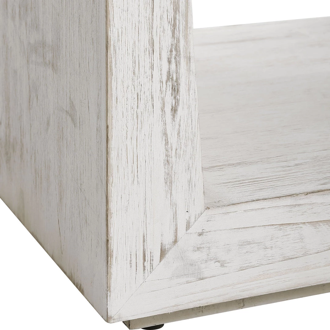 Embodying A Fresh And Airy Feel, This Coastal Inspired Bench Features A Suspended Seat In An Off-white Waffle Weave Polyester Blend Fabric, Doubling As A Seat Or Footrest. The Solid Wood Base Is Finished In A Rustic Warm Whitewashed Finish With Noticeable Rub-through And Wood Grain Details.