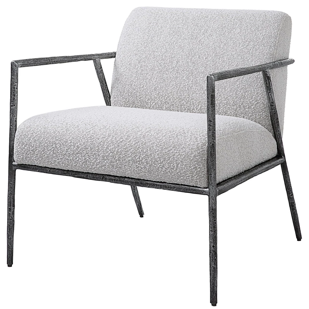 With Clean Contemporary Lines, This Open Frame Design Features A Textured Cast Iron Frame In A Natural Distressed Charcoal Finish. Paired With A Tight Upholstered Seat In A Casual Ivory And Warm Gray Boucle Fabric. Seat Height Is 18″.