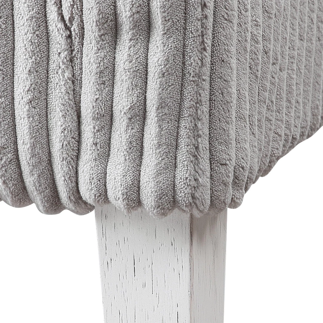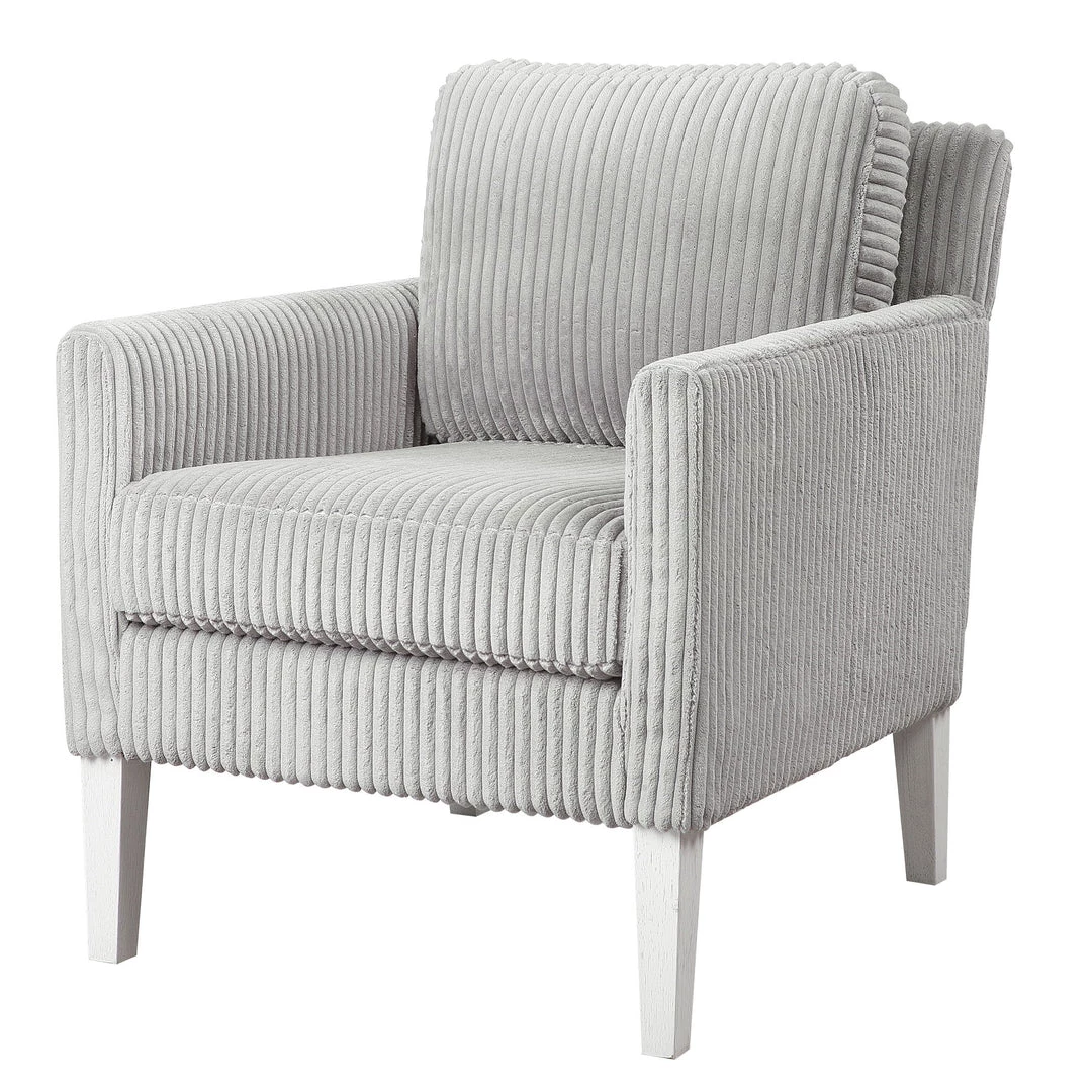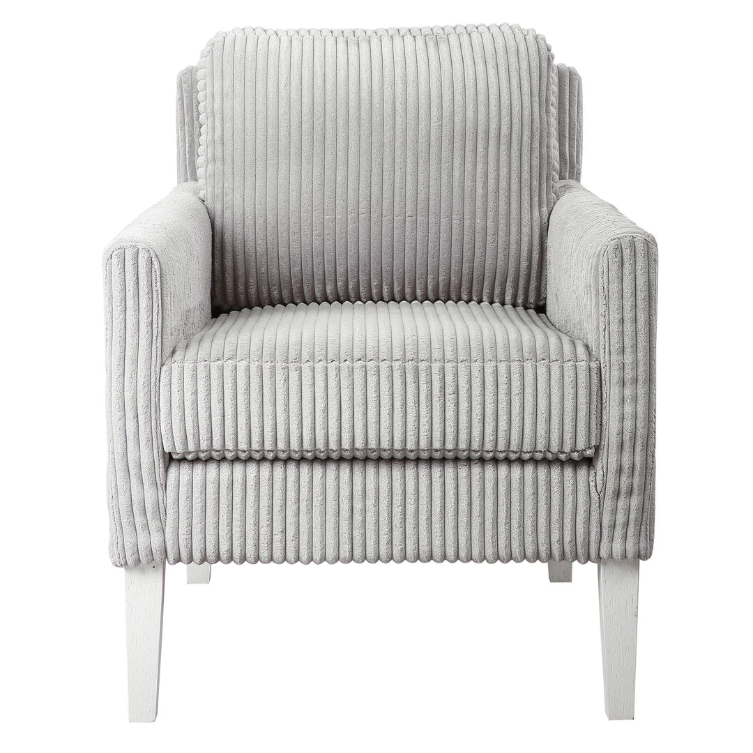 Blending Style And Comfort, This Fashionable Accent Chair Is Covered In A Luxurious Fluted Steel Gray Fabric And Is Accented By White Oak Finished Legs With Naturally Distressed Details. Seat Height Is 20″.