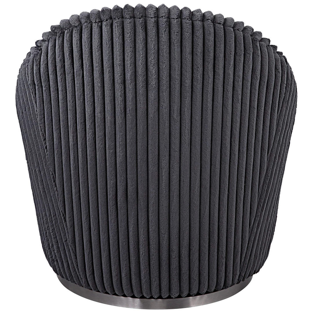 A Contemporary Accent With A Modern Edge, This Chair Is Upholstered In A Luxurious Fluted Gunmetal Chenille Fabric And Is Accented By A Stainless Steel Swivel Base Finished In Brushed Nickel. Seat Height Is 19″.