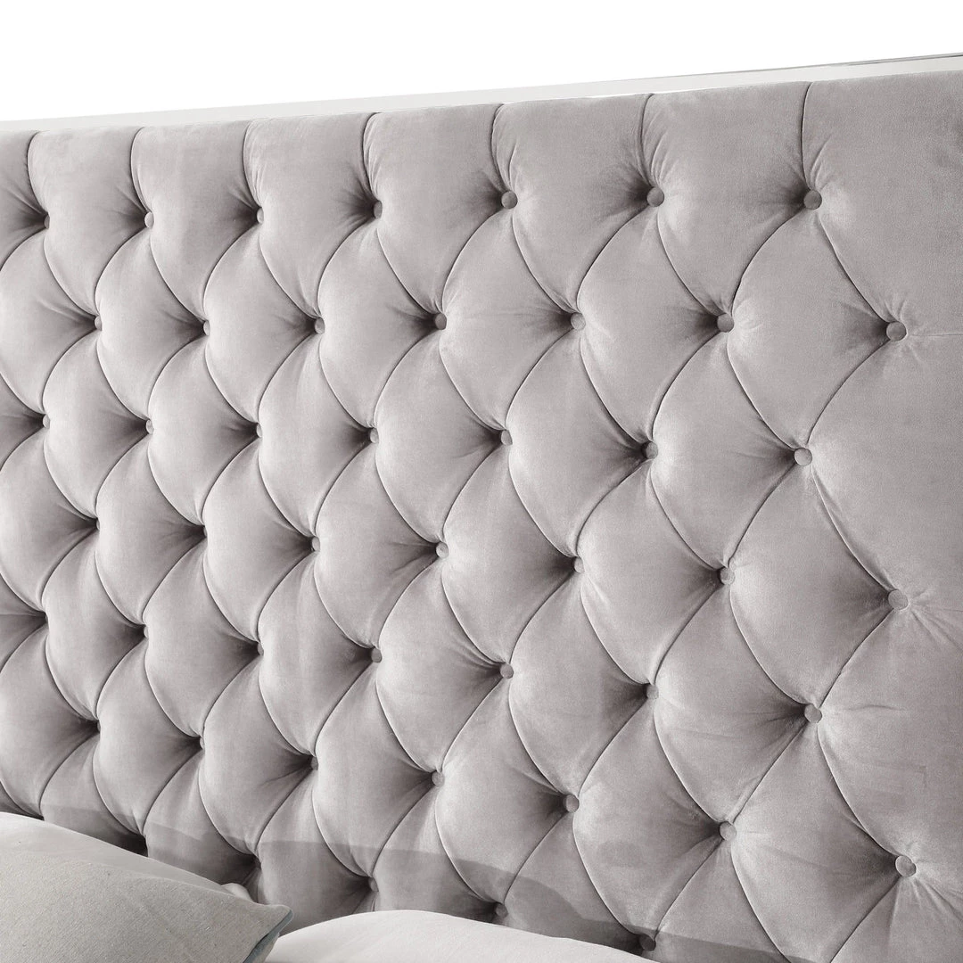 Create your sophisticated, luxurious master retreat with the Lacey bedroom collection. Luscious velvet-like fabric in silver gray is detailed with chrome trim and deep button tufts creating elegant softness. Transform your home with the stylish details and timeless beauty of Lacey!