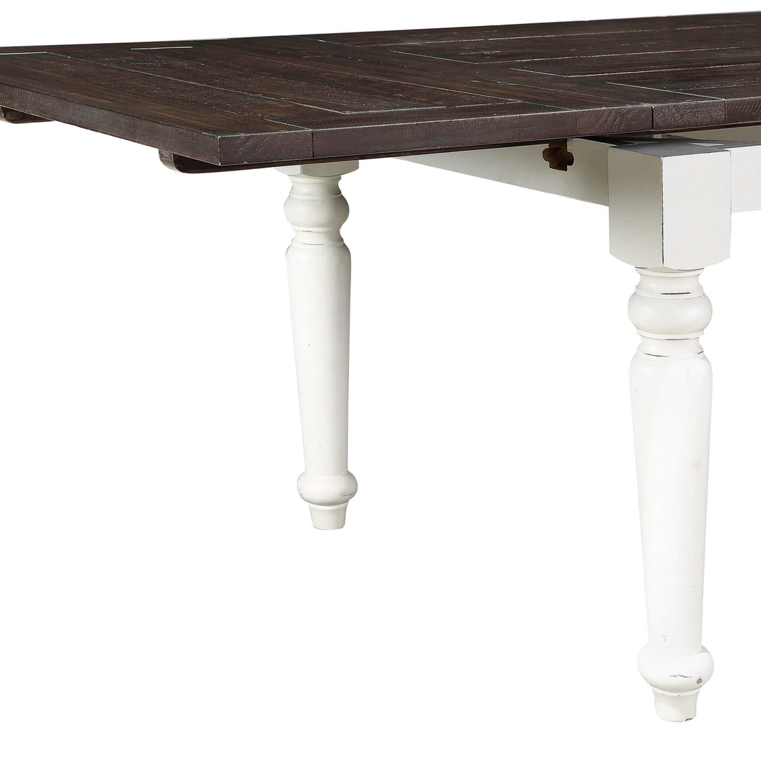 Developed with an emphasis on period authenticity, Mountain Retreat blends the strength of pine solids with the rustic texture of rough sawn timbers. Starting with a dark mocha color applied to the thick, planked table top, the two-tone finish pairs a soft, antique white to the heavy turned legs. Cross-brace elements on the seat backs and buffet doors complete the classic country style of Mountain Retreat.