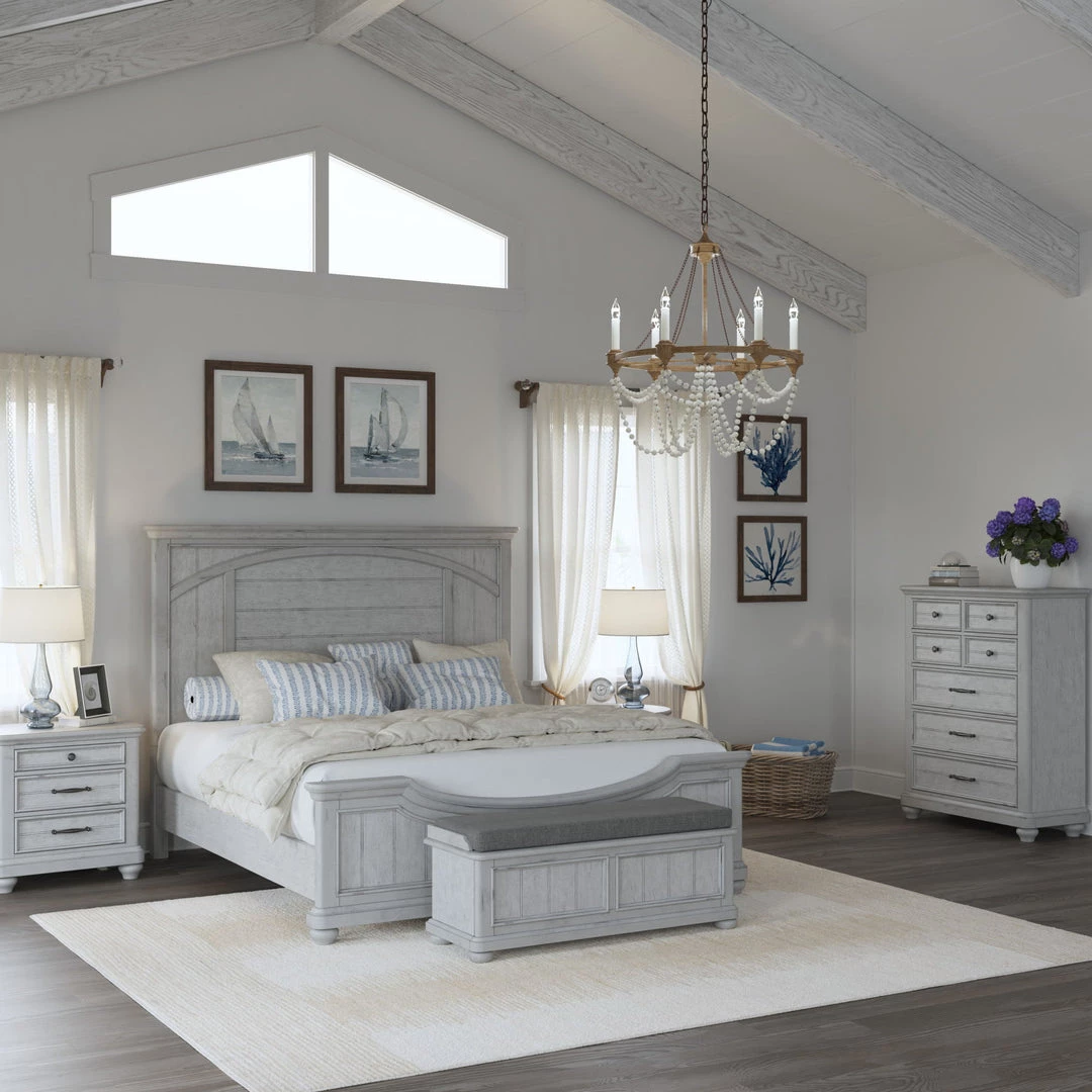 Grand in scale but casual in feel, the New Haven bedroom collection is an easy winner decorated with classic arches, scored fronts, and turned wood details. The oyster shell finish with light distressing lends a weathered appearance that pairs with charming antique pewter pulls and knobs for a seaside look. Make your home feel like summer year-round with the charmingly coastal New Haven collection.
