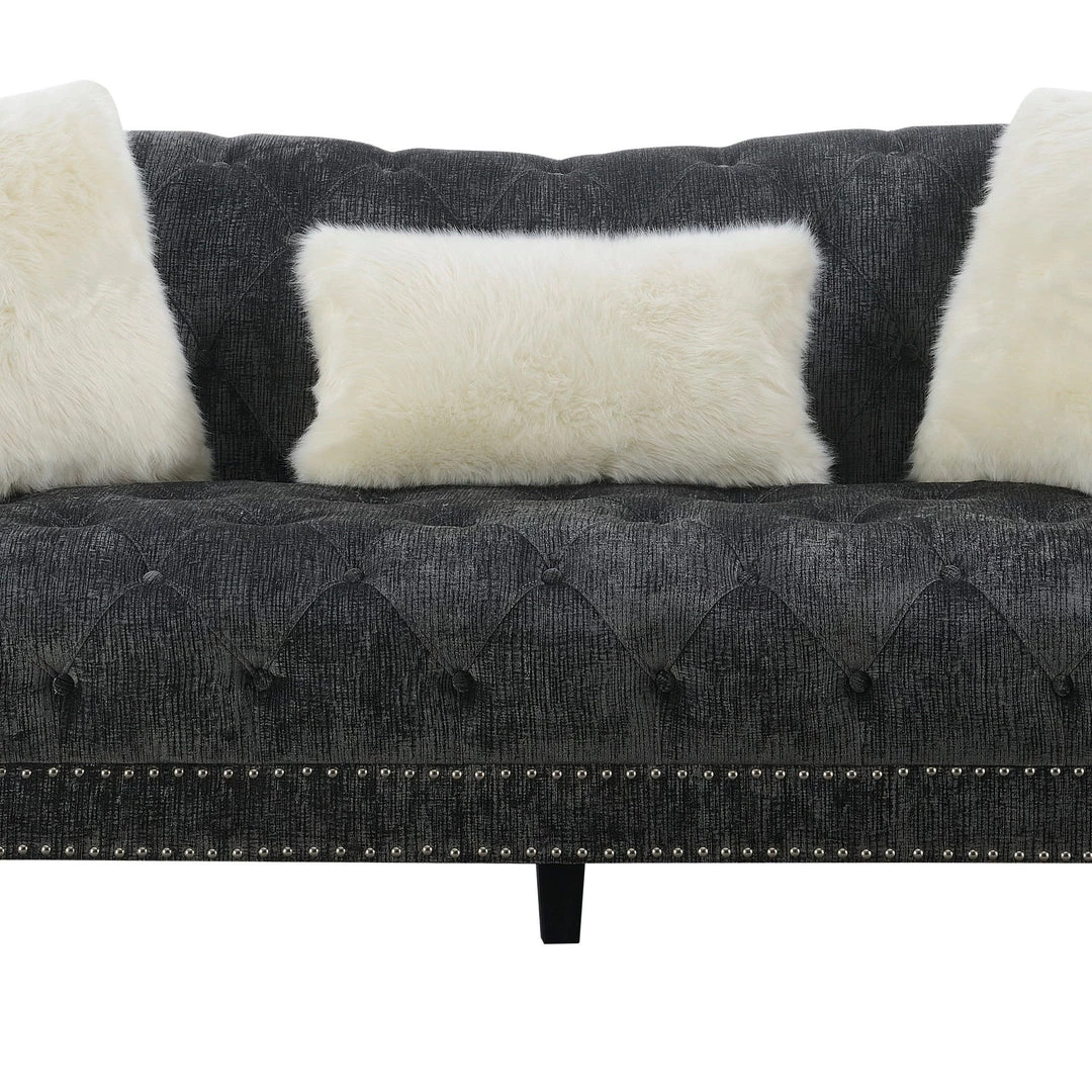 The stylish, tufted Hutton II collection will add sophistication to any room. The plush fabric cover has generous button tufting and brushed nailhead trim. The tapered wooden bun legs and coordinating accent pillows add to its uniqueness and style. Matching accent chairs, chaise, and large square cocktail ottoman allow for many different group arrangements with the Hutton II collection.