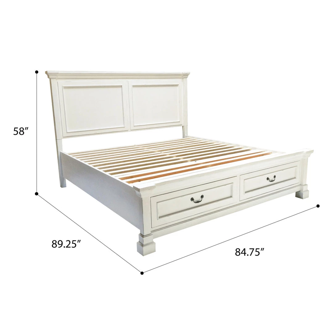 - The Stoney Creek king storage bed offers large-scale designs combined with a textured, antiqued white finish. Giving additional charm, the antiqued, blackened metal hardware and tapered leg details complete this relaxing retreat.