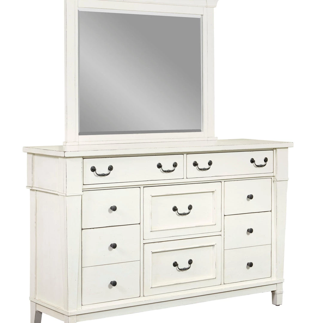 - The Stoney Creek mirror offers large-scale designs combined with a textured, antiqued white finish. Giving additional charm, the antiqued, blackened metal hardware and tapered leg details complete this relaxing retreat.