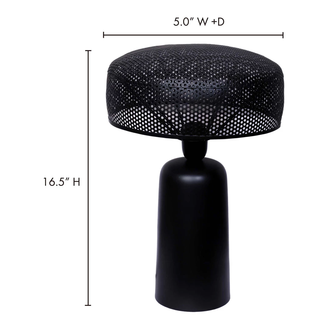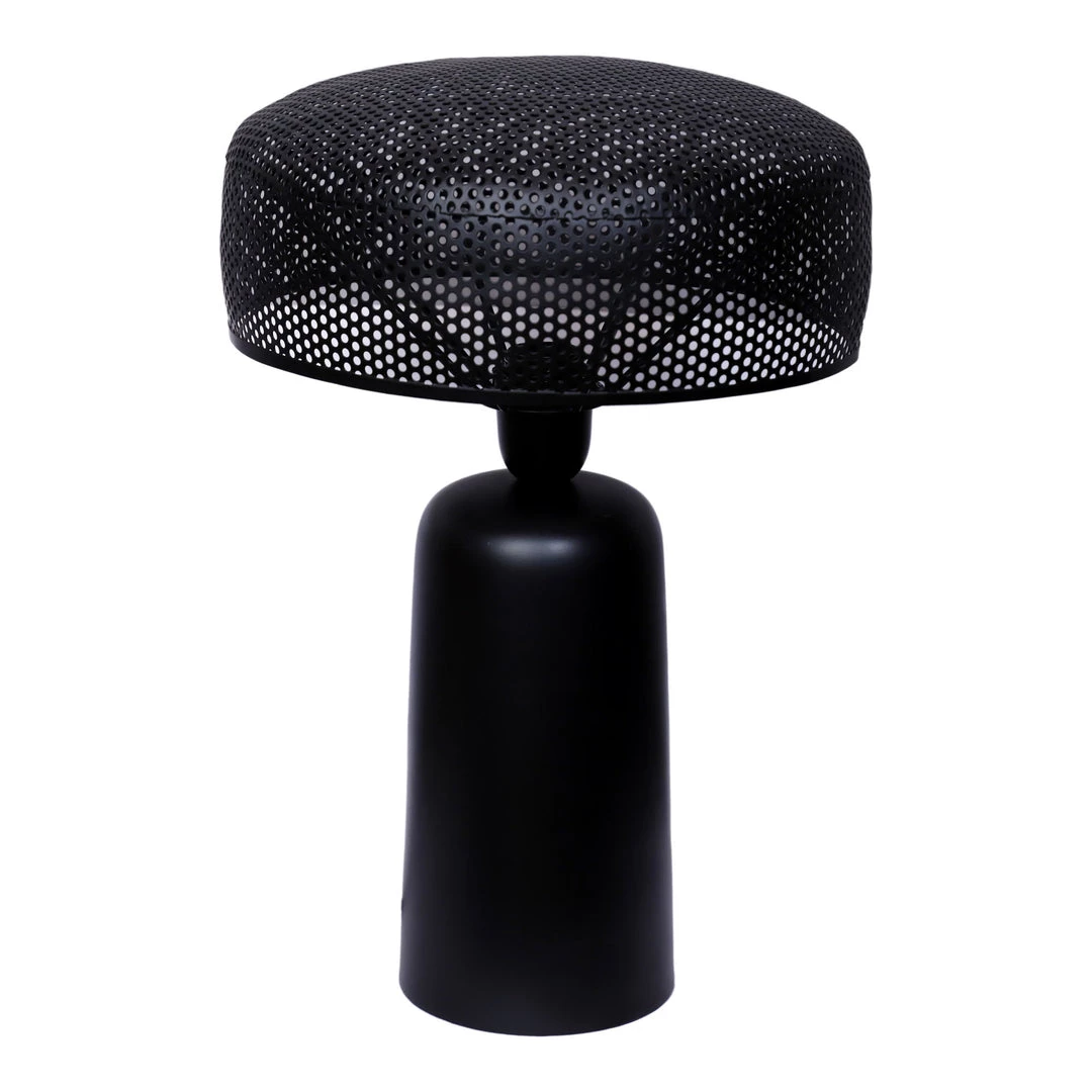This sleek contemporary table lamp features a perforated iron lampshade. A cool, modern accent light with a black finish.