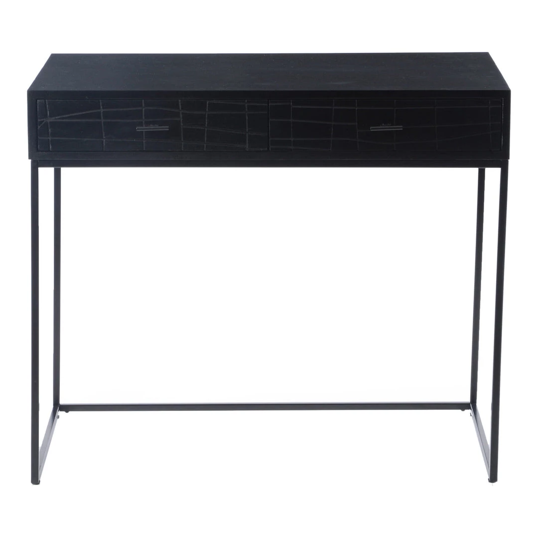 The Atelier desk is an idyllic, stylish workstation that features two sliding drawers with a textured front and a cool iron frame that supports its minimal design.