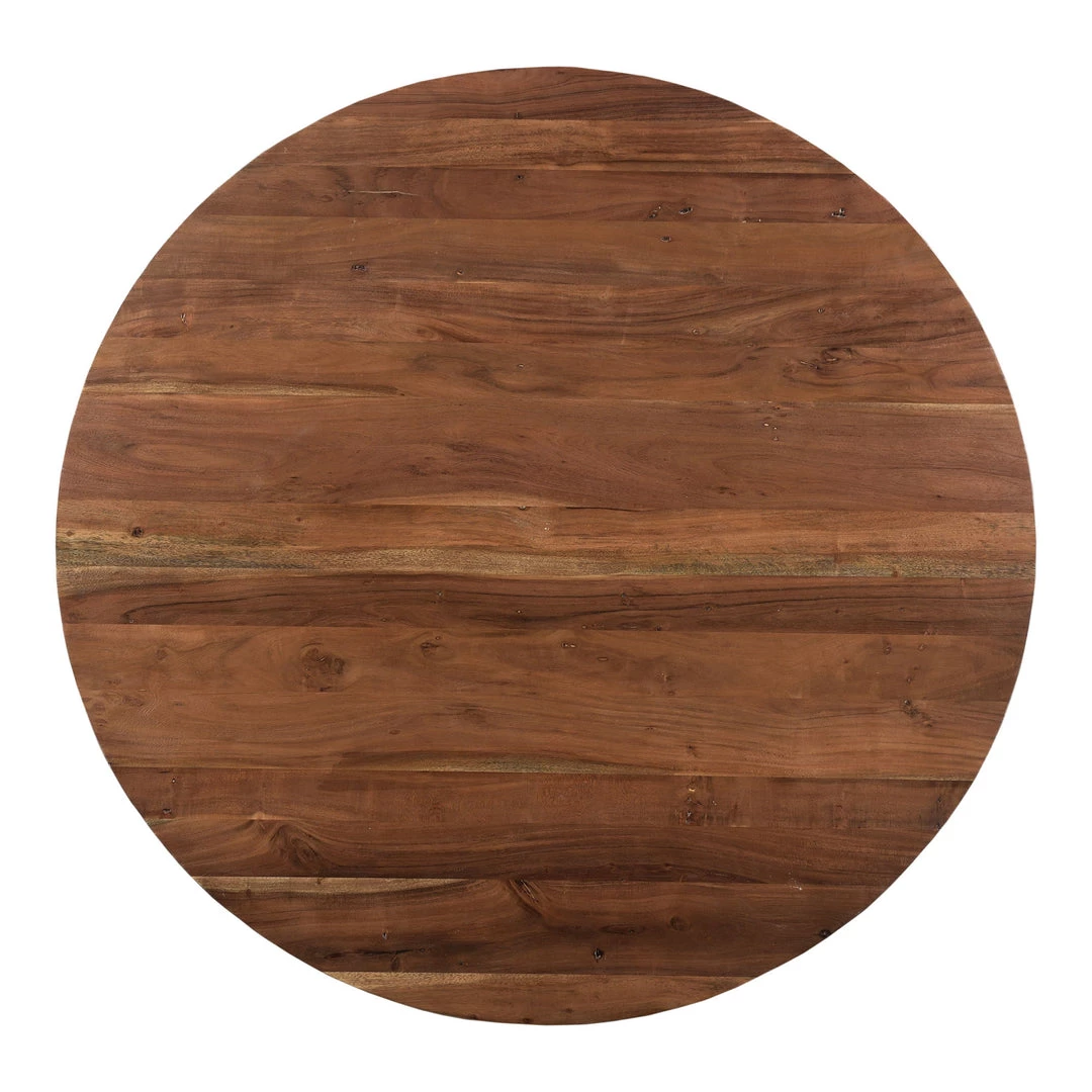 The Bent round dining table is made of beautiful solid acacia, with the unique knots and whorls of the wood put front and center. Offset by a curved industrial base, this dining table is a gorgeous organic highlight for your dining area.