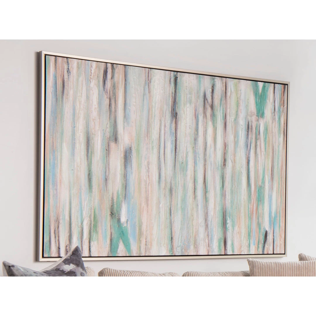 The organic, earthy greens and faded blues of this painting will blend seamlessly into any design style. A showstopping piece of wall décor. Comes framed.