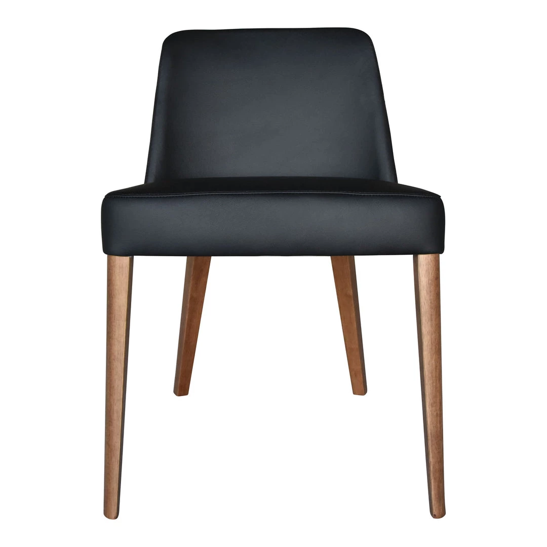 The Outlaw dining chair features beautiful form with its flared back legs, stately black top-grain leather, and a backside that features tufted stitch detailing.
