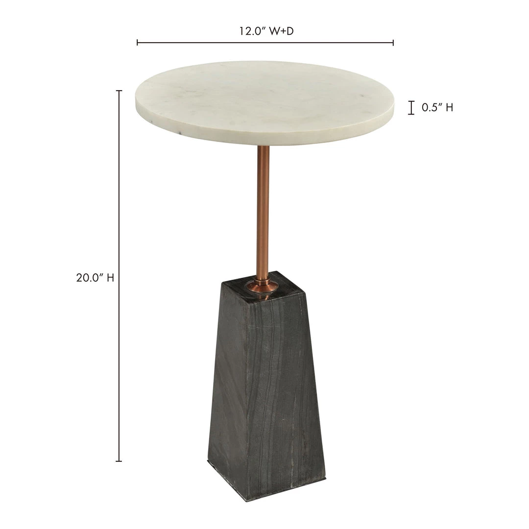 A black marble base soars up to a white marble surface, with rose gold connecting the two. A luxurious and exquisitely designed modern accent table for your living space.