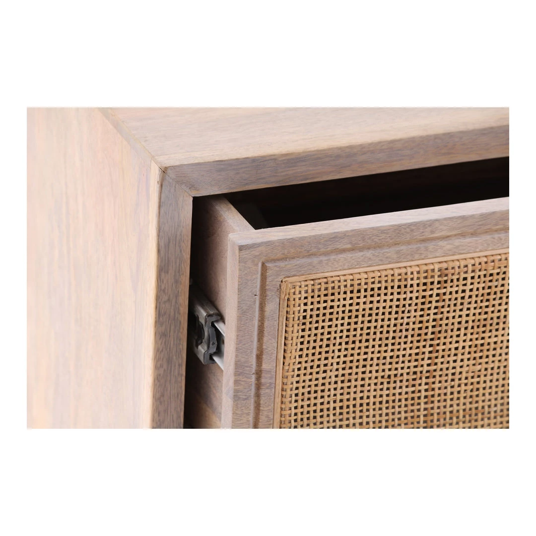 A Scandi-style dresser in a refined combination of light-colored, solid mango wood and natural woven cane detailing with three spacious drawers fixed with side-mounted glides, and sturdy legs for lasting durability.